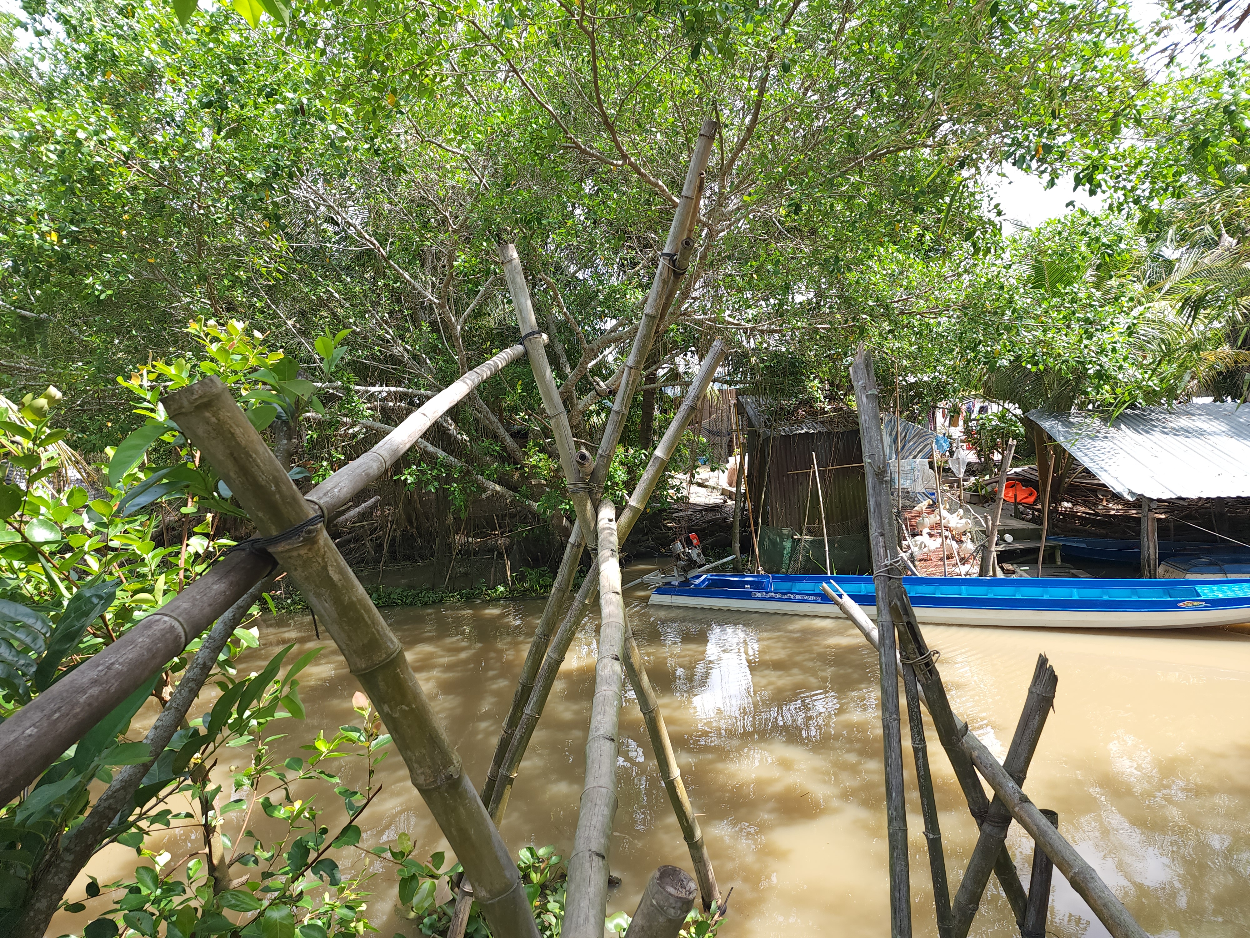 집앞에 냇가를 건너는 대나무 외다리..