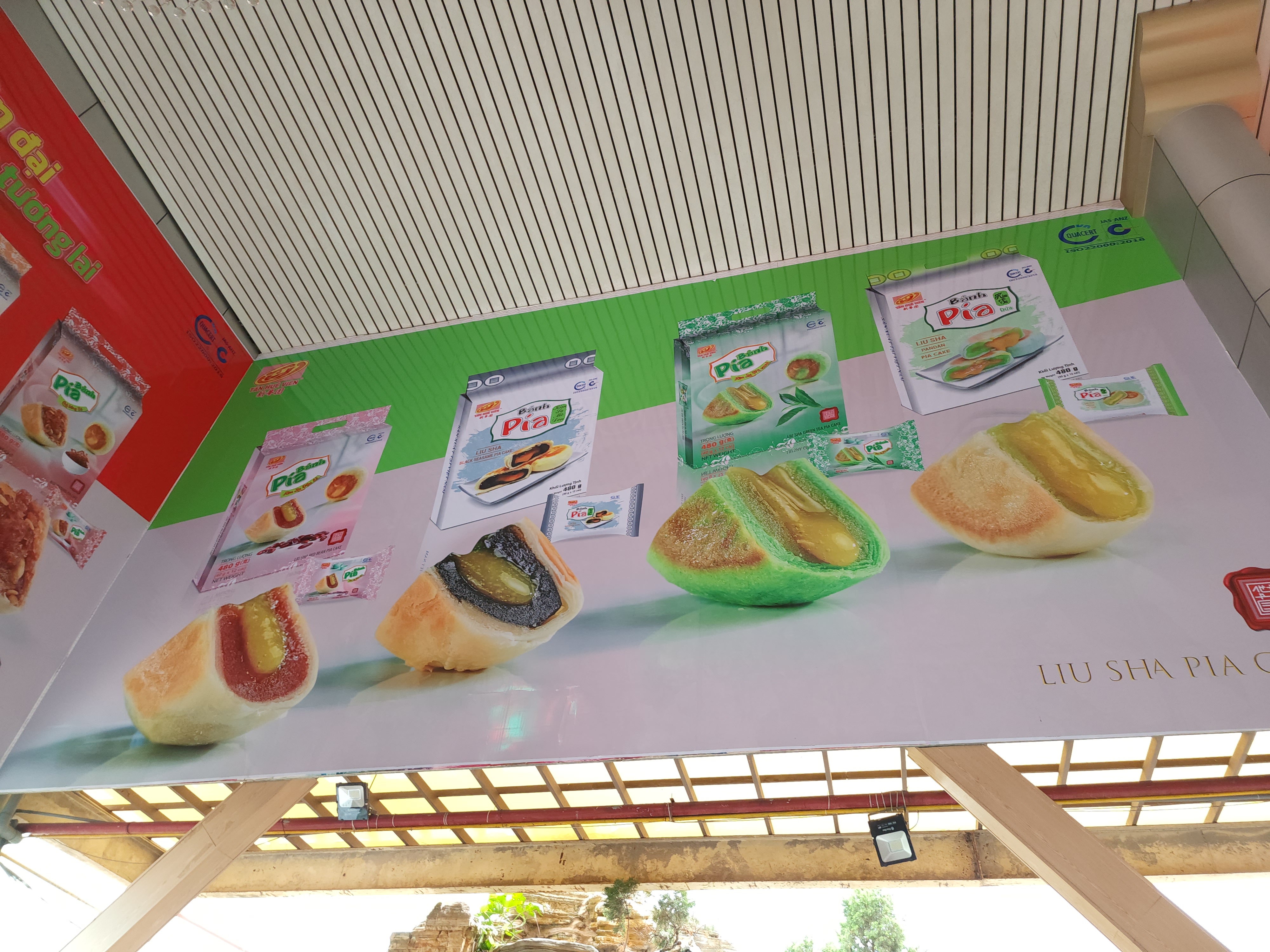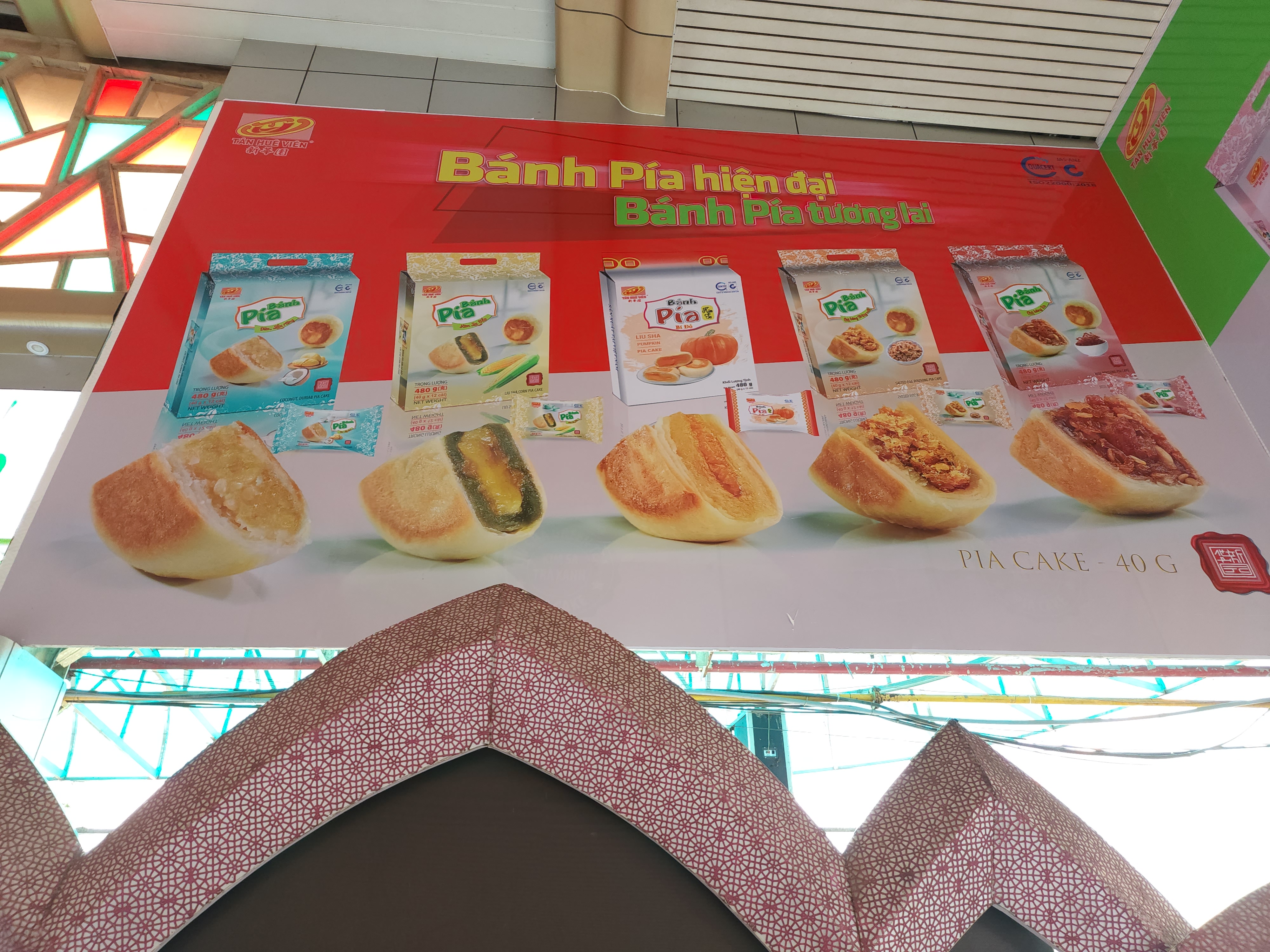 대표적인 빵이 Bánh Pía 가 종류별로 홍보하고 팔고 있다.