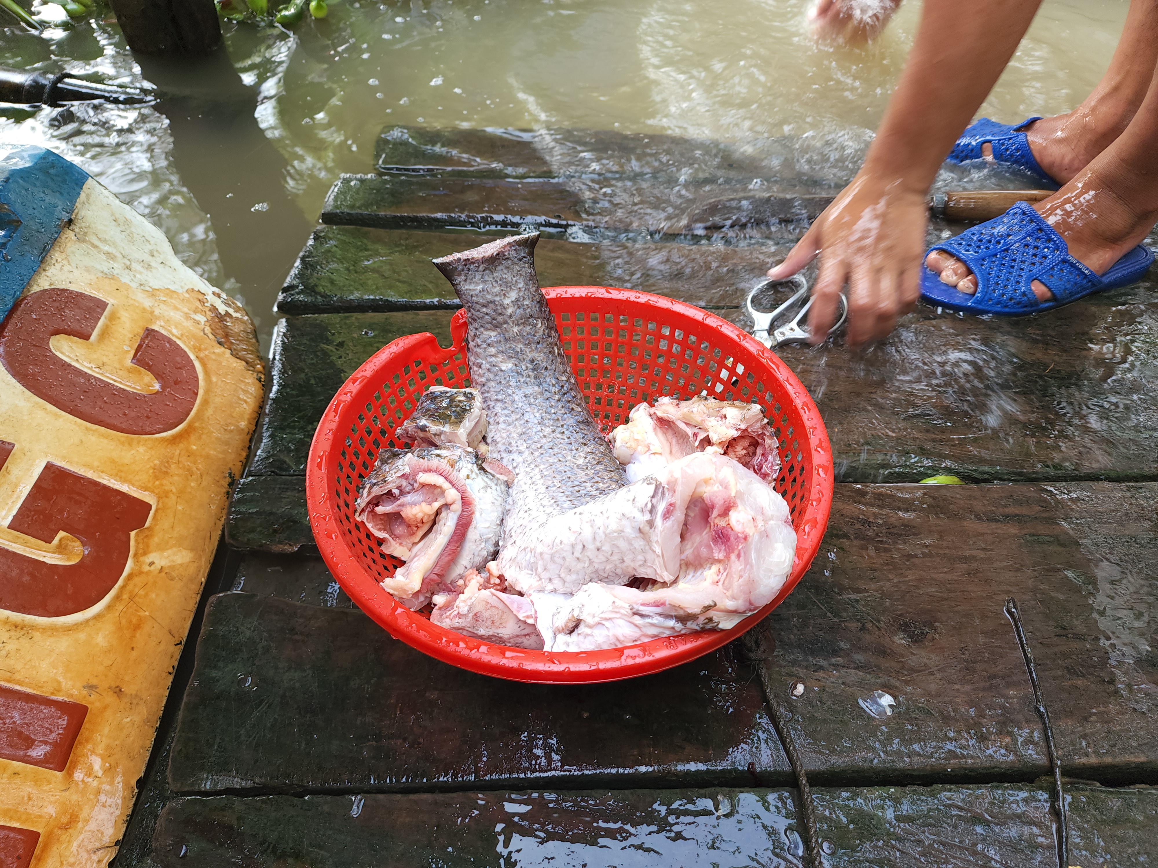 집앞 냇가에서 까럽 생선을 손질합니다.