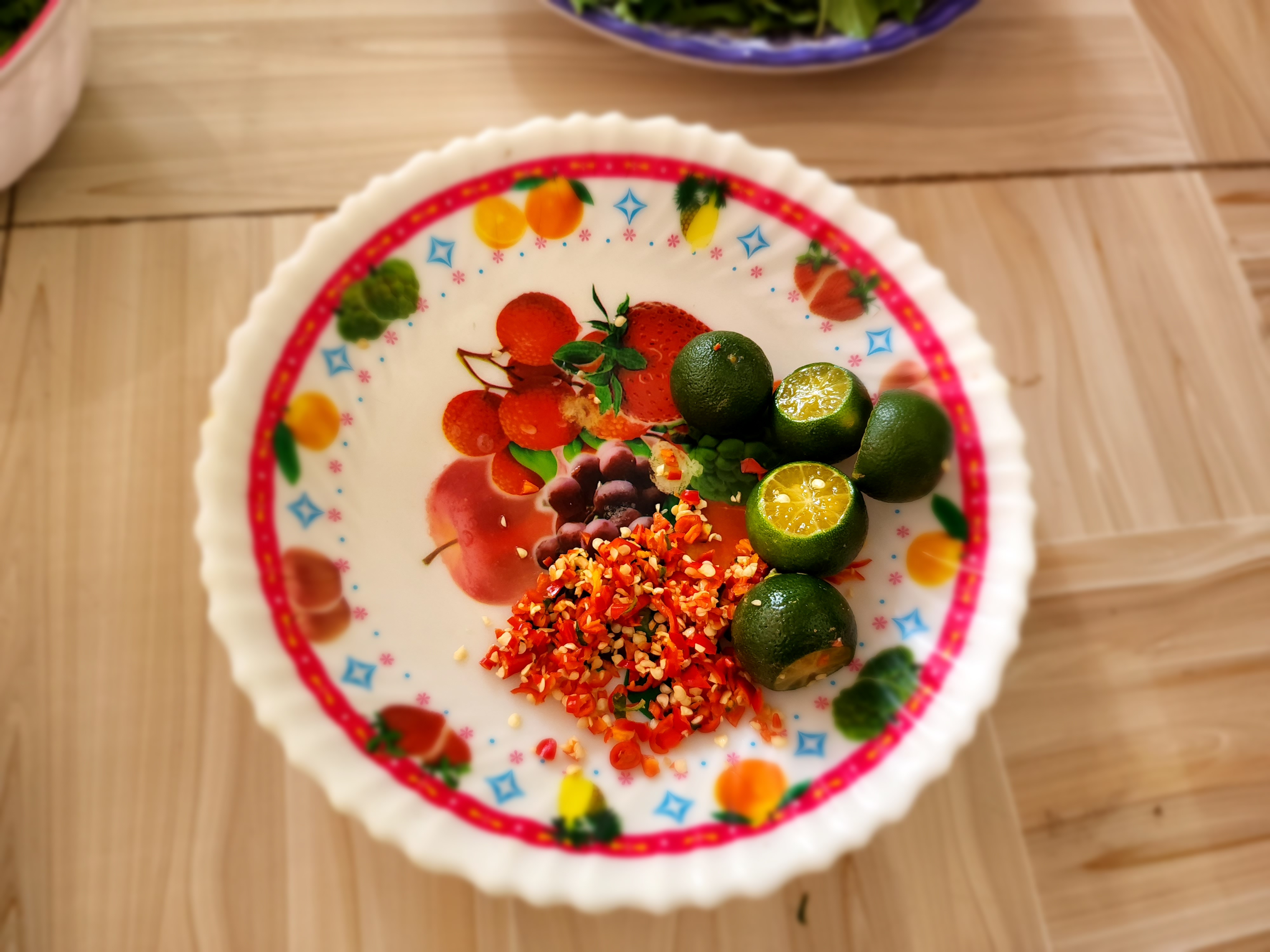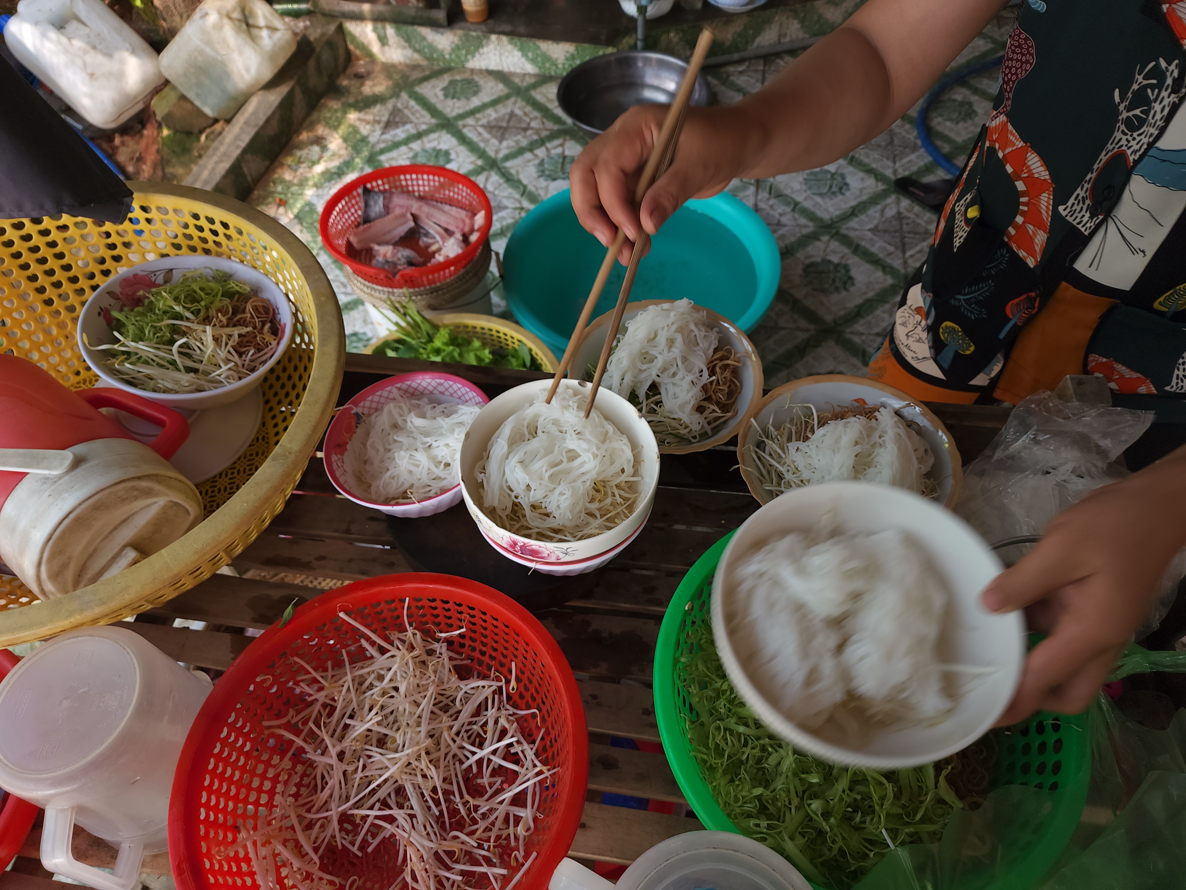 야채를 넣고 위에 분(면)을 얹습니다.