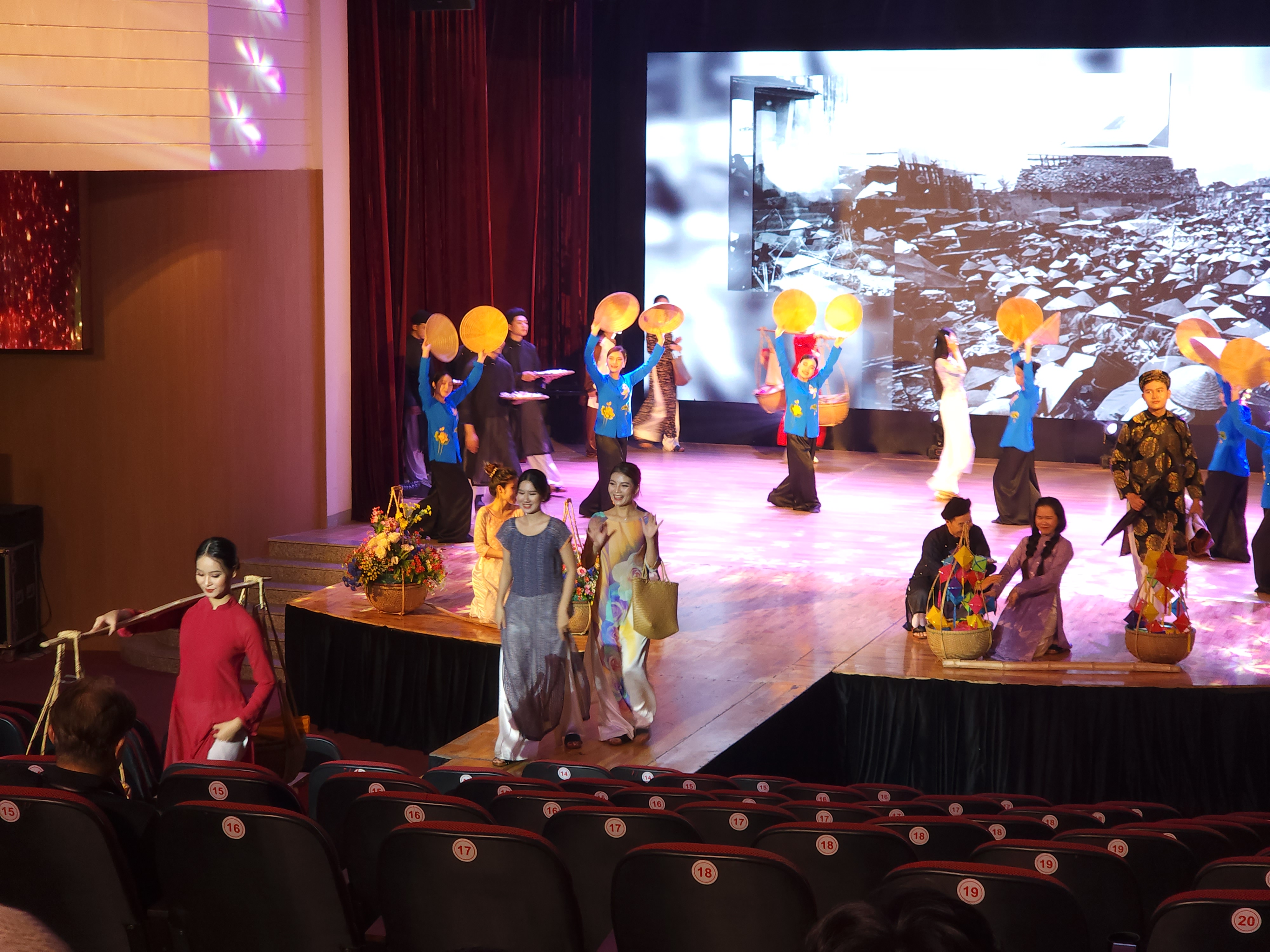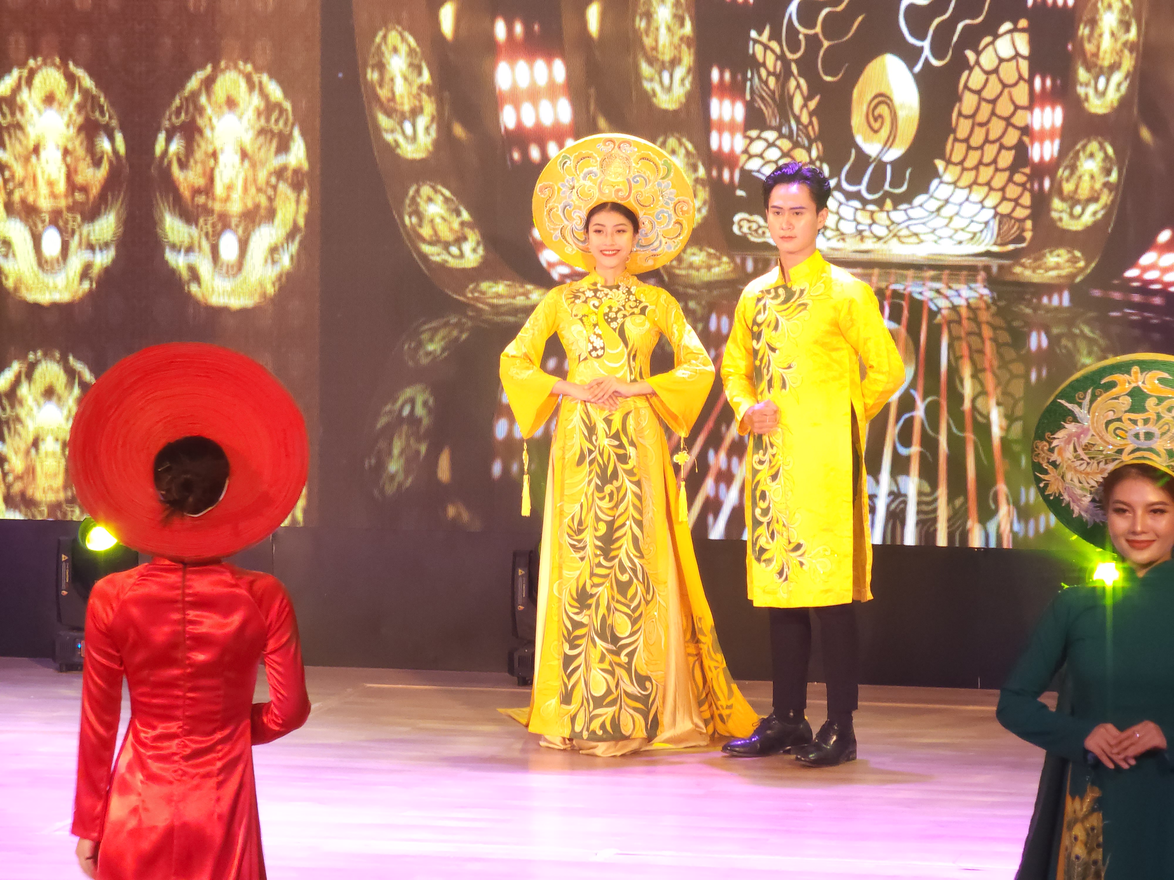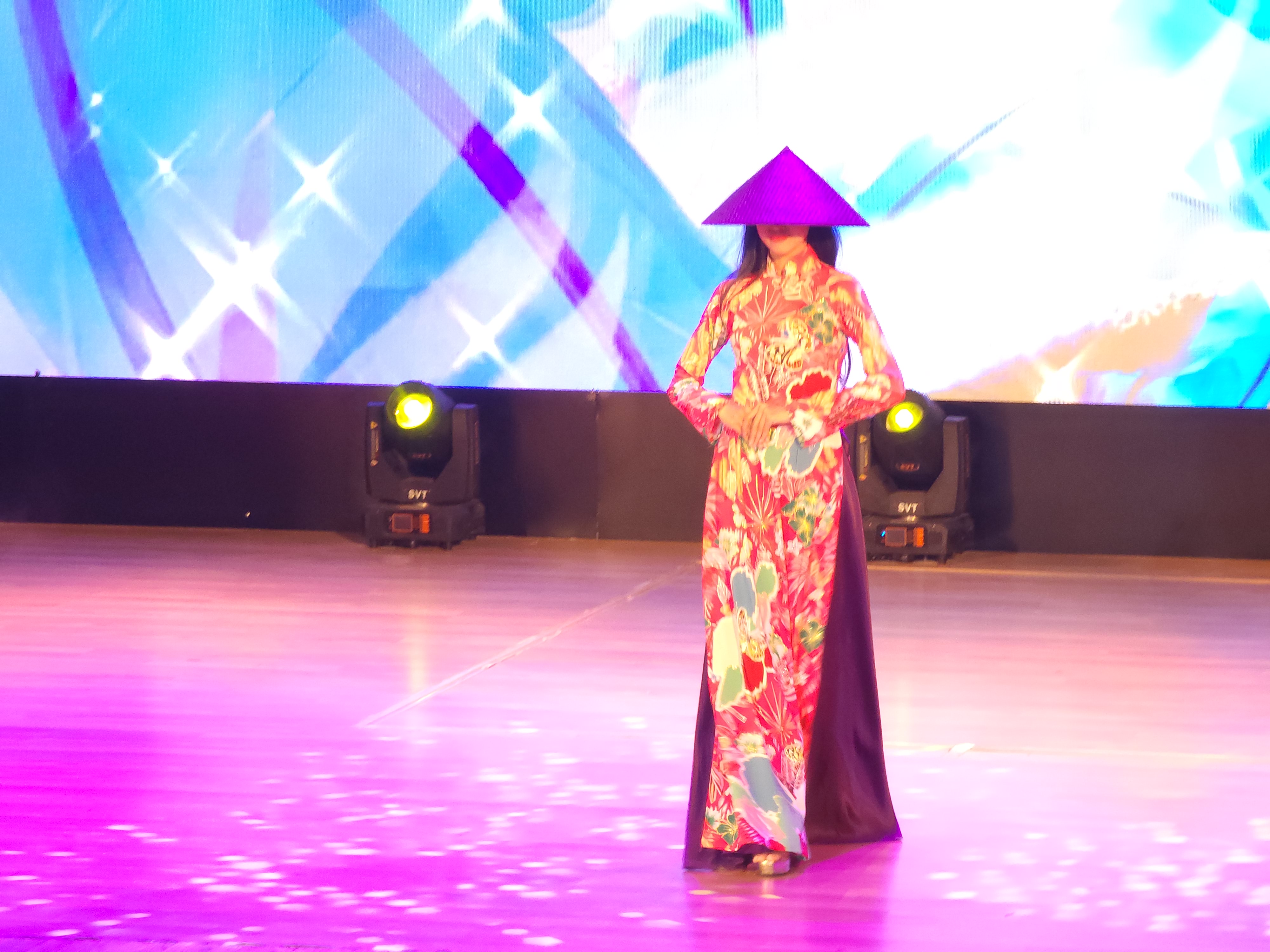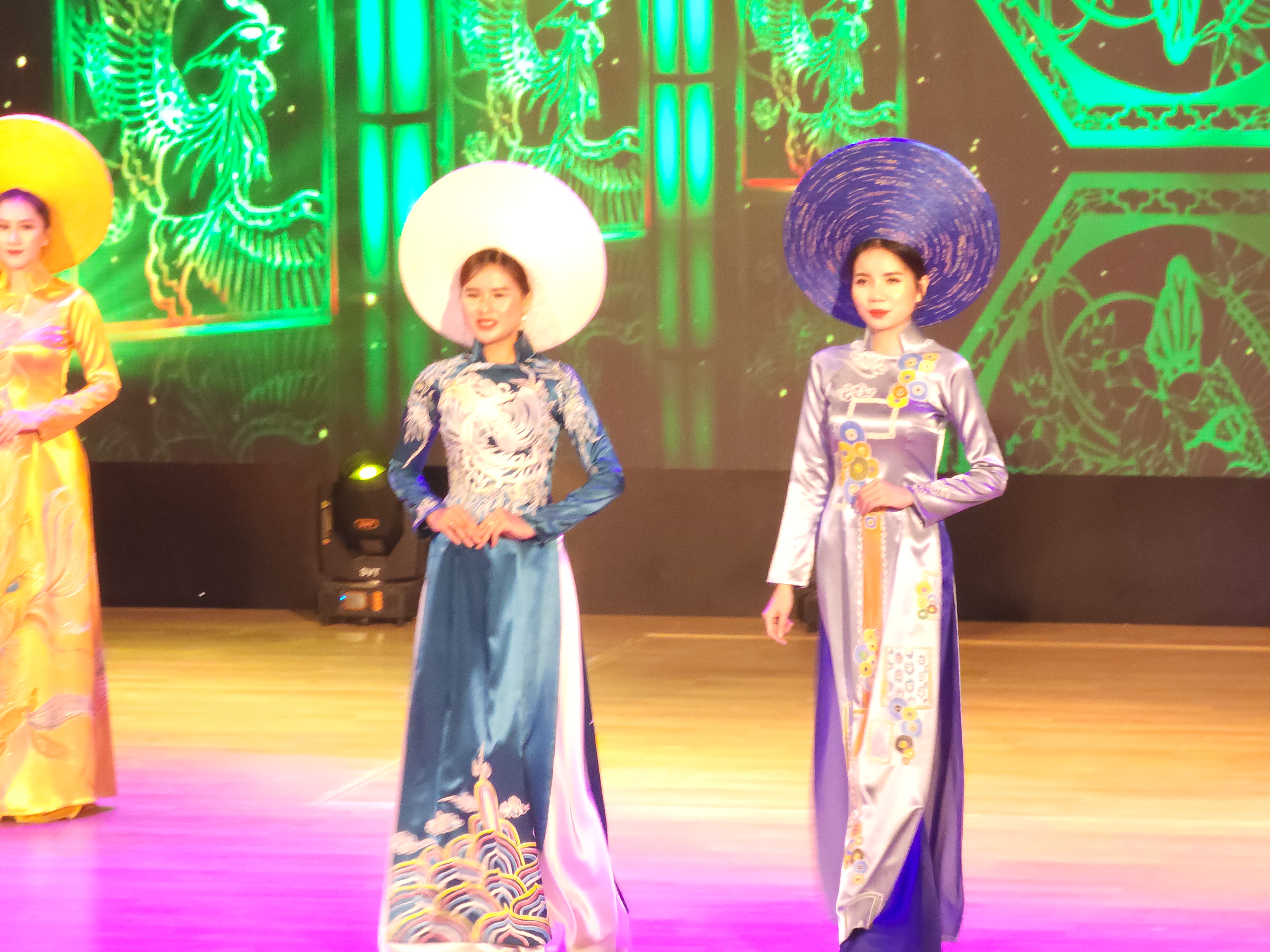화려한 아오자이쇼가 논라(모자)를 쓰고 입장하면서 워킹하고 있다.