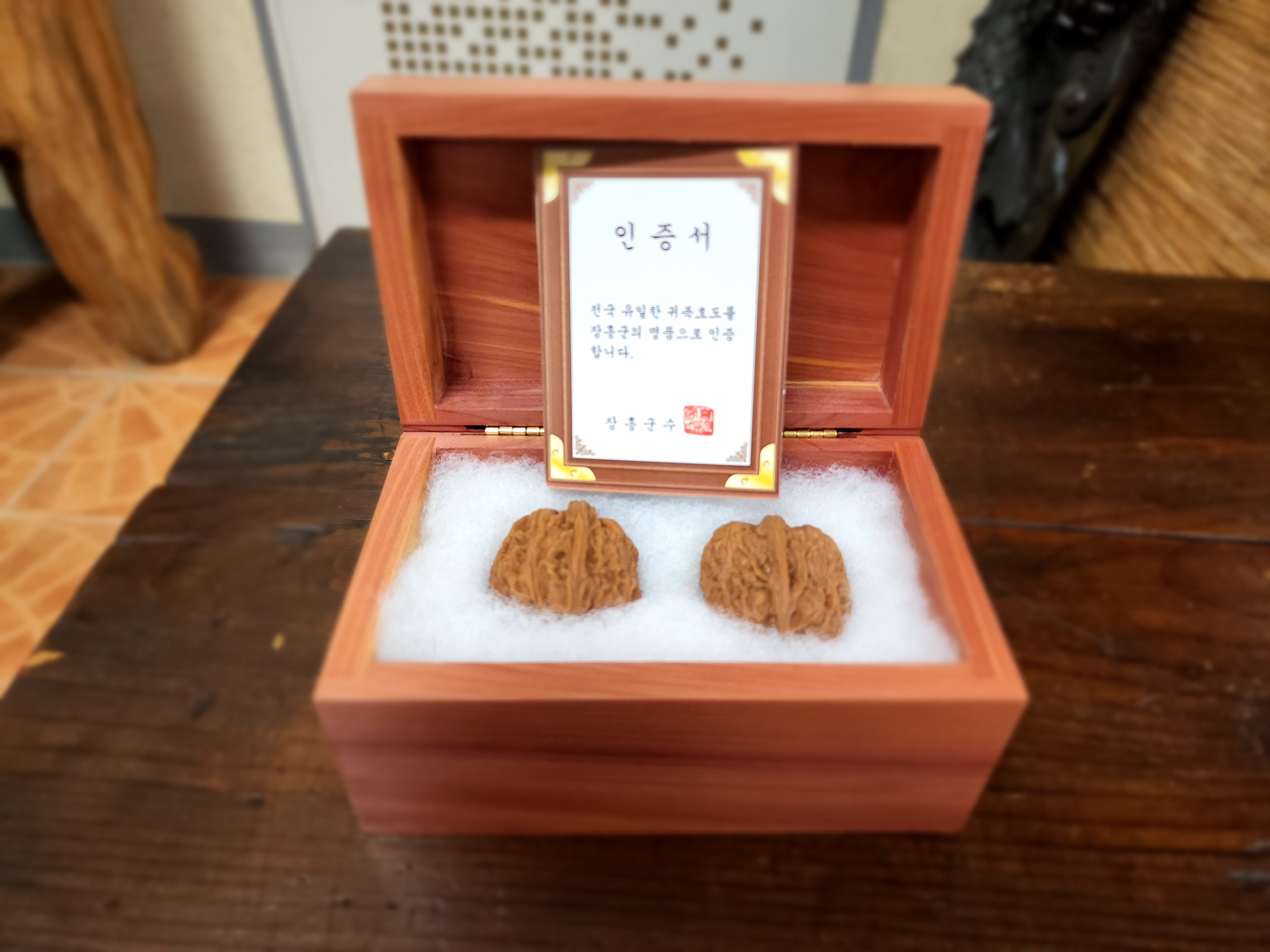 귀족호도는 전남 장흥에서만 자라는 호도나무로 안에 내용물이 없는 대신 울퉁불퉁 각진 모양 덕분에 손 지압용으로 이용된다.