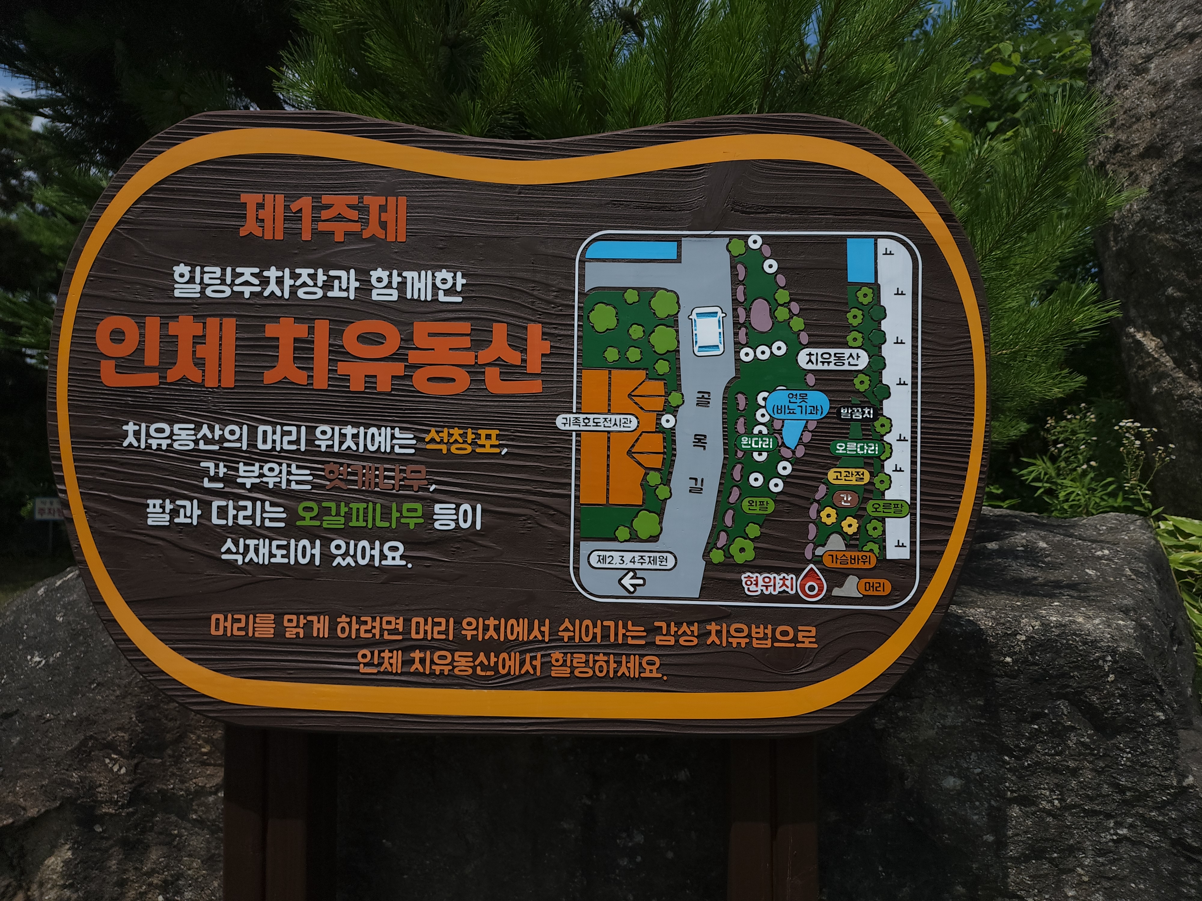 귀족호도박물관 입구 오른쪽에 제1주제 인체 치유동산이 있다.주차를 하면 바로 만날 수 있다.