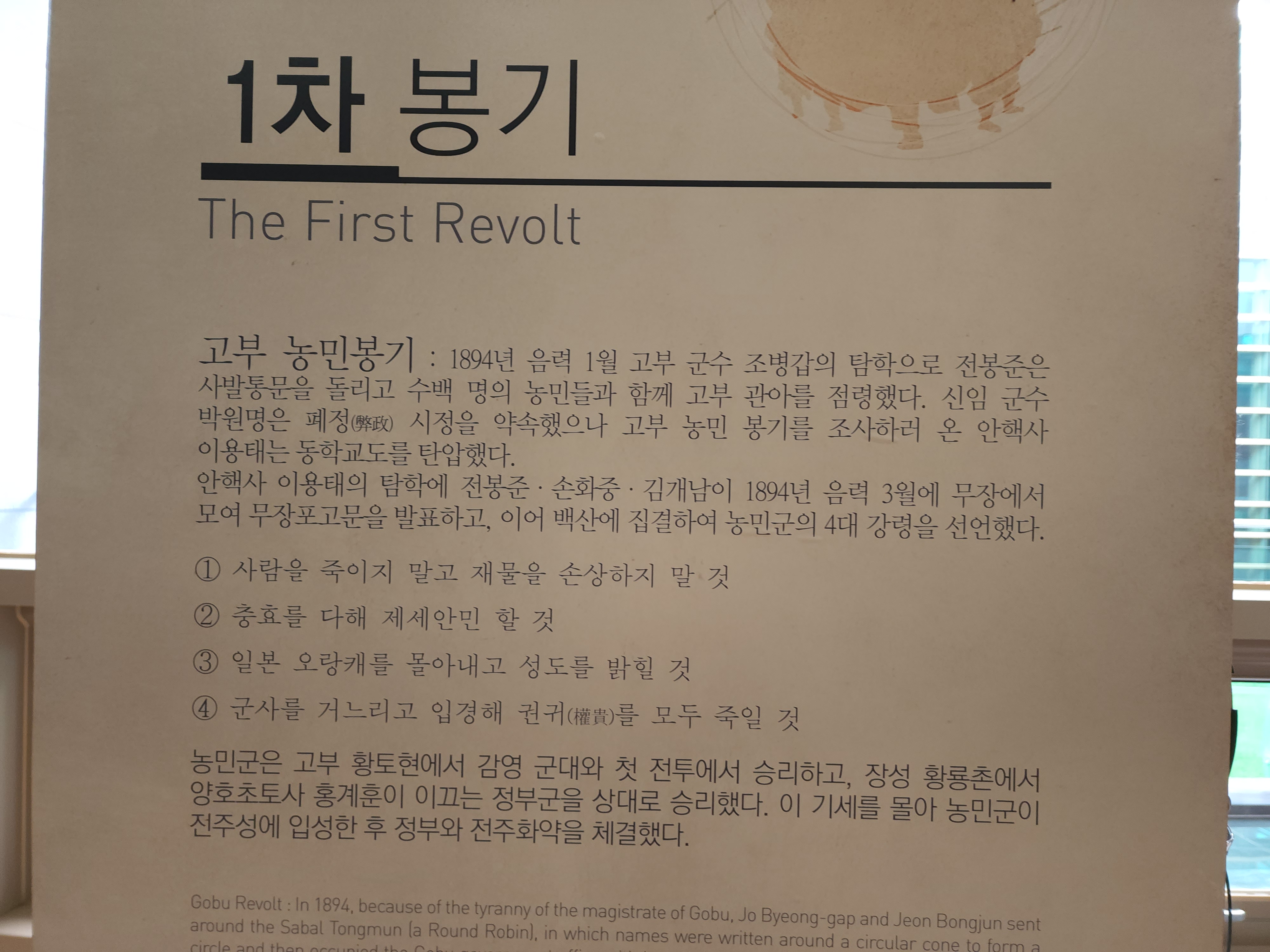1차봉기는 1894년 음력 1월에 일어났다. 전북 정읍시 고부 군수 조병갑의 탐학으로 전봉준은 사발통문을 돌리고 수백명의 농민들과 함께 고부 관아를 점령했다. 신임 군수 박원명은 폐정 시정을 약속했으나 고부 농민 봉기를 조사하러 온 안핵사 이용태는 동학교도를 탄압했다.
