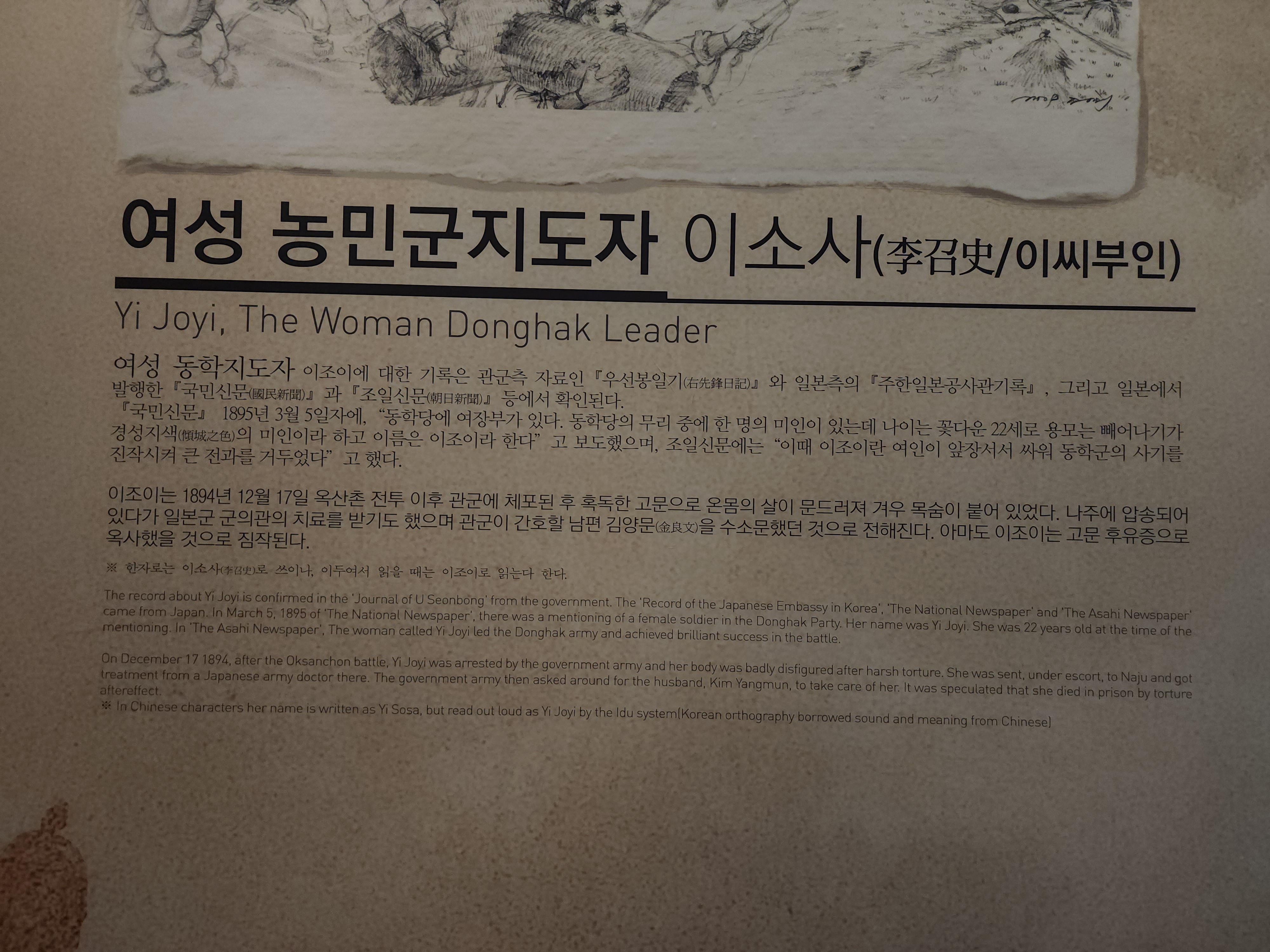 "국민신문" 1895년 3월 5일자에 "동학당에 여장부가 있다. 동학당의 무리중에 한 명의 미인이 있는데 나이는 꽃다운 22세로 용모는 빼어나기가 경성지색의 미인이라 하고 이름은 이조이라 한다" 고 보도했으며 조일신문에는 "이때 이조이란 여인이 앞장서서 싸워 동학군의 사기를 진작시켜 큰 전과를 거두었다"고 했다.