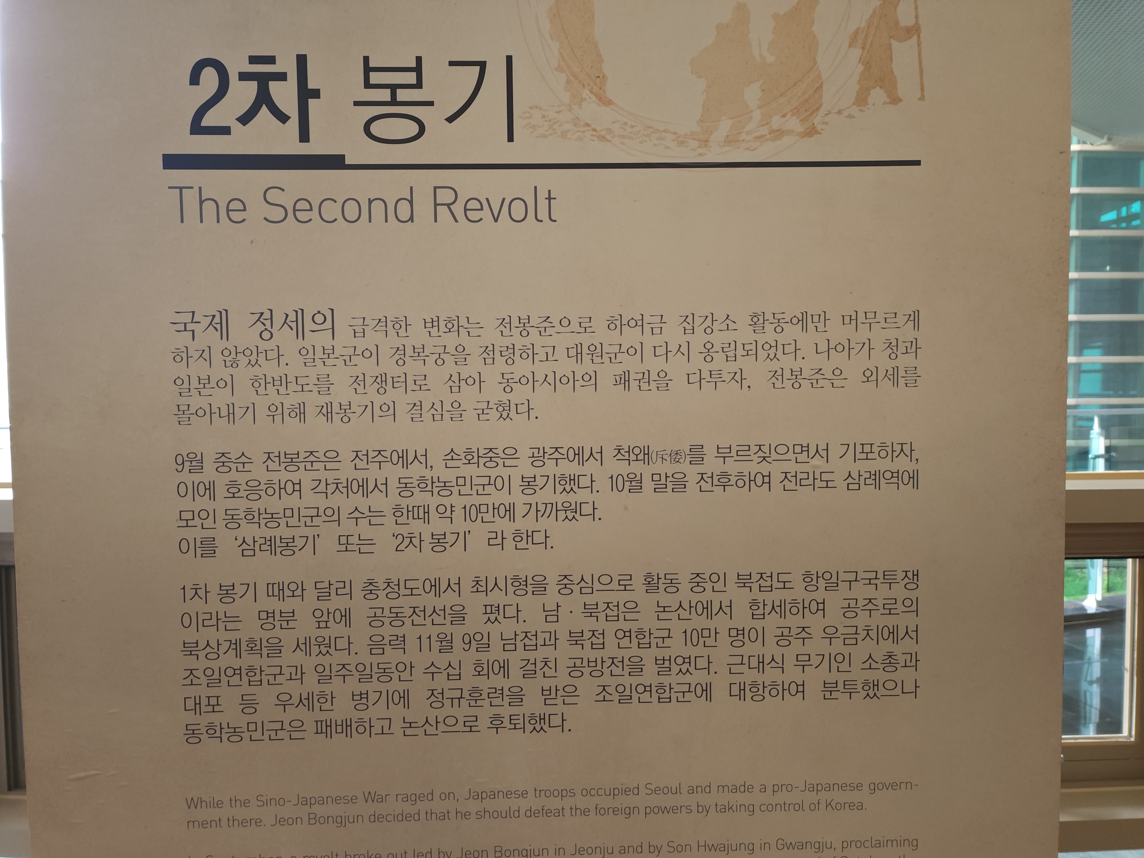 관람을 마치면 아이와 함께 할 수 있는 다양한 체험프로그램이 기다리고 있다. 사발통문에 이름 적기, 장태 굴리기, 동학군 되어보기 등 타임머신을 타고 여행하는 즐거움을 만낀할 수 있다. 그리고 동학혁명기념관 밖에는 기념탑도 있다.