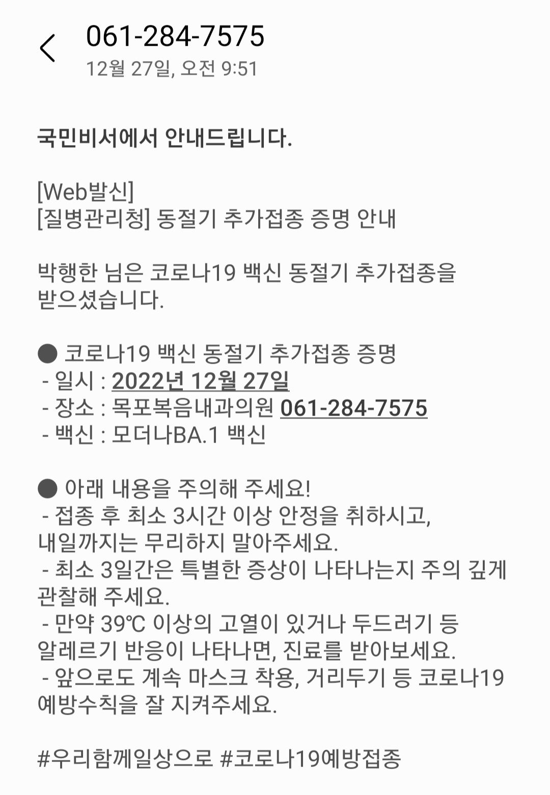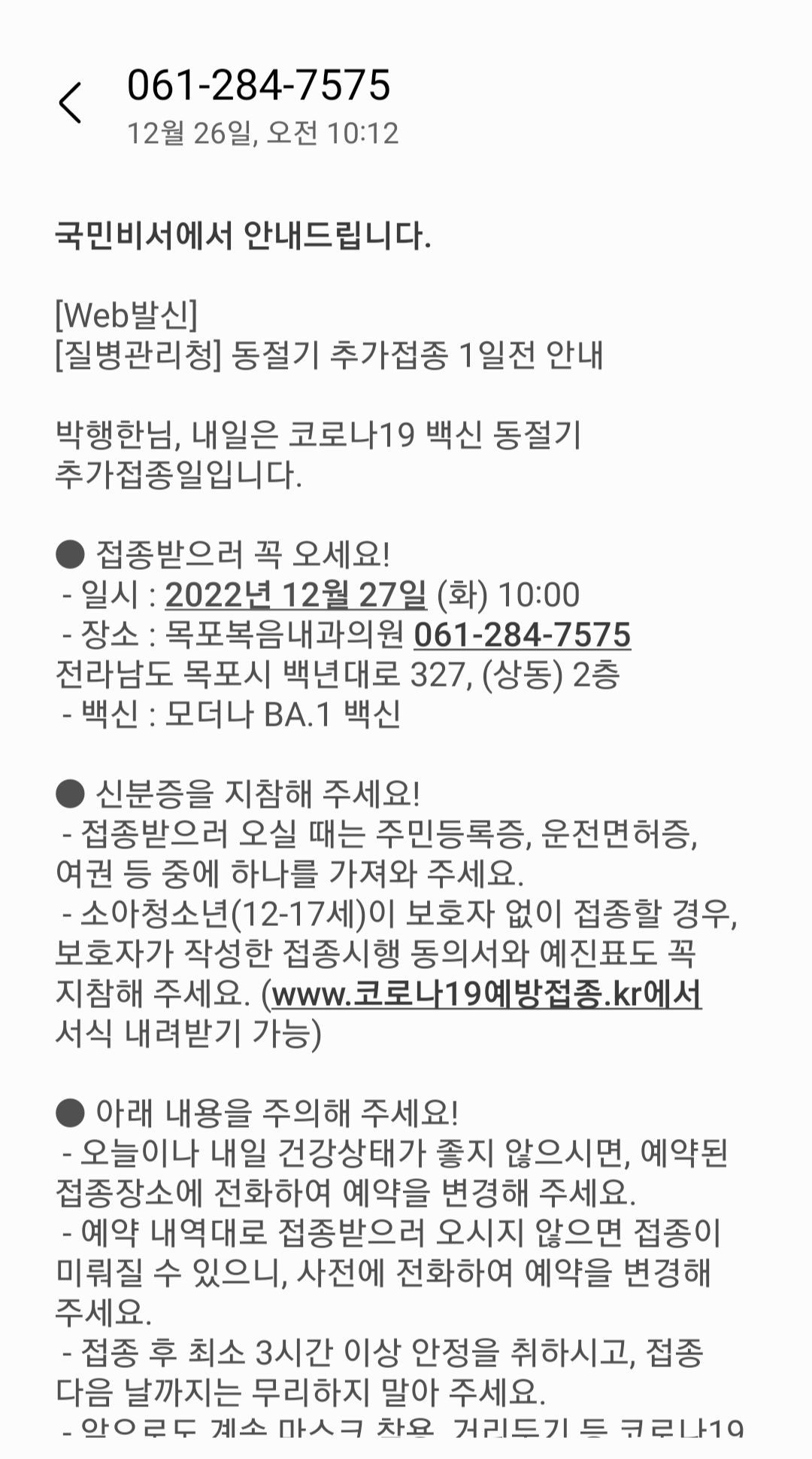 예방접종을 하고 나오고 조금 있으면 예방접종후 주의사항을 국민비서가 문자로 알려준다.