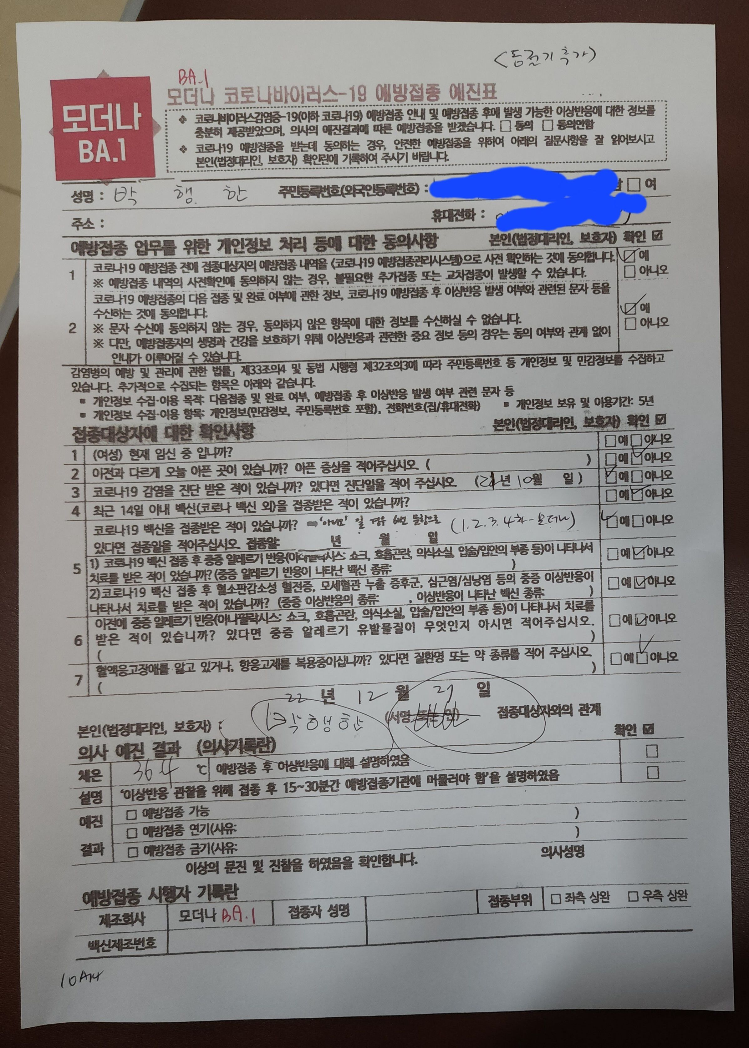 2022년 12월 19일 월요일 5차 바이러스-19 동절기 예방접종을 예약했다.