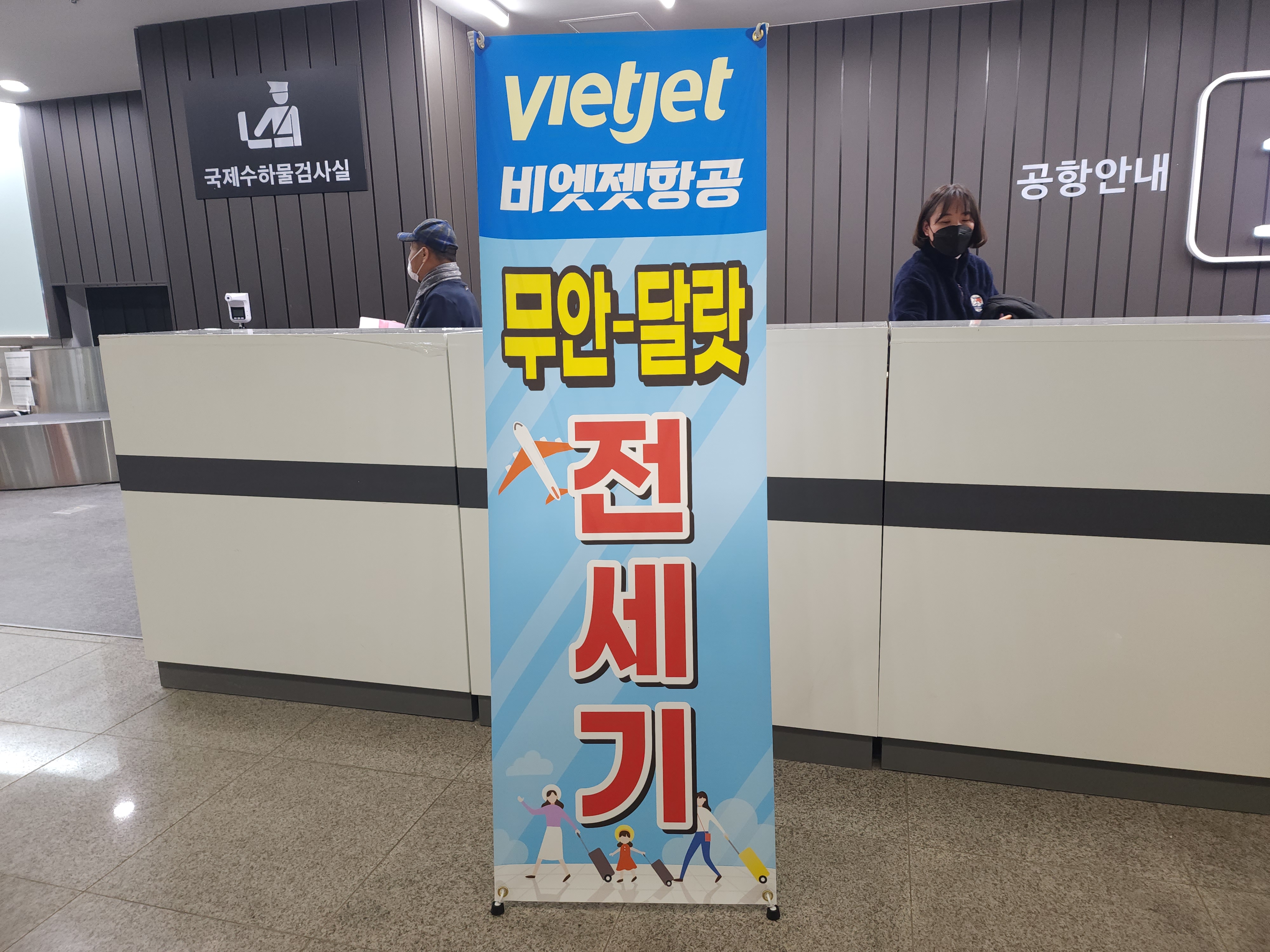전남 무안국제공항 전세기 베너 앞에서 모여서 비엣젯항공을 티켓팅한다.