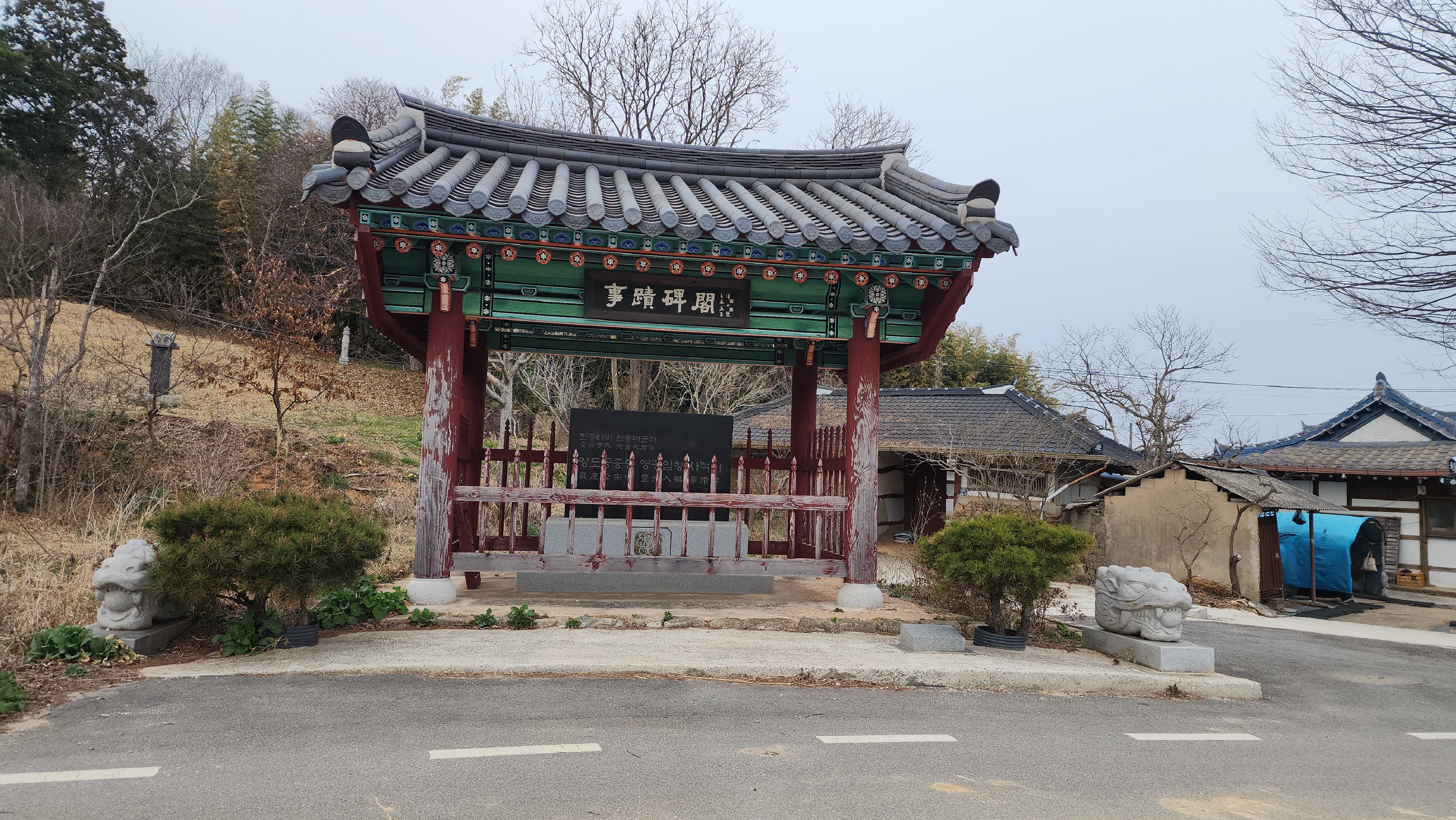 당산마을 입구이다. 위쪽은 "만취당 이황종선생 기적비"이며 아래는 "마을표시비"와 "효자비"이다.