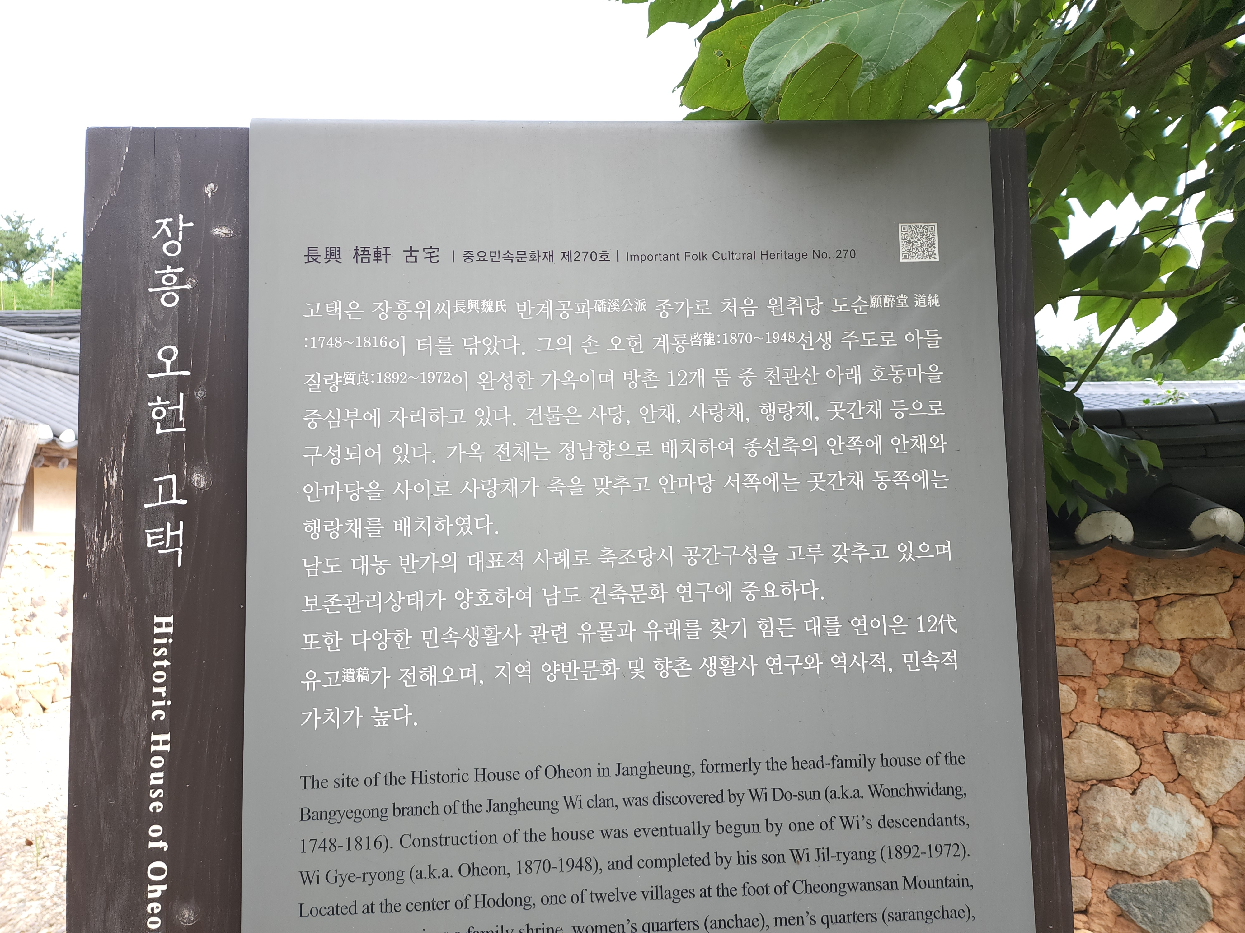 중요민속문화재 제270호로 지정된 오헌고택은 장흥위씨 반계공파 종가로 처음 원취당 도순(1748~1816)이 터를 닦았다.