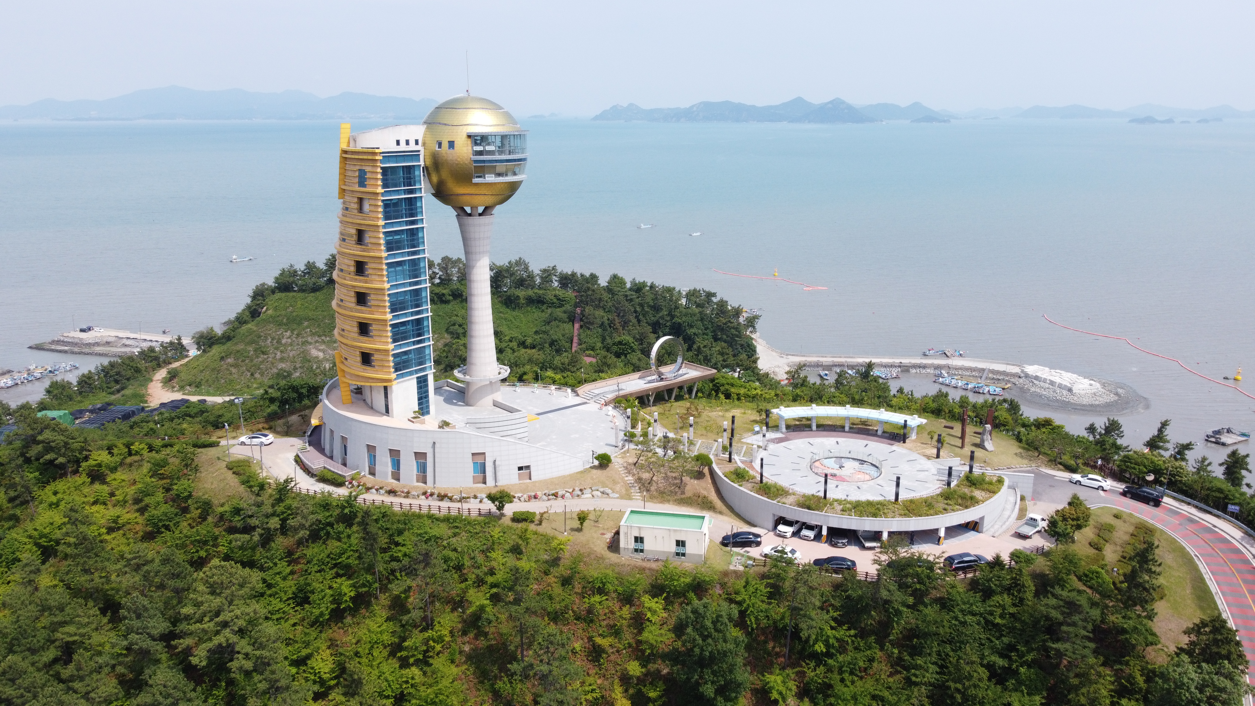 정남진 전망대의 트레이드마크인 전망타워는 태양과 황포돛대, 그리고 파도를 형상화해 만들었다.