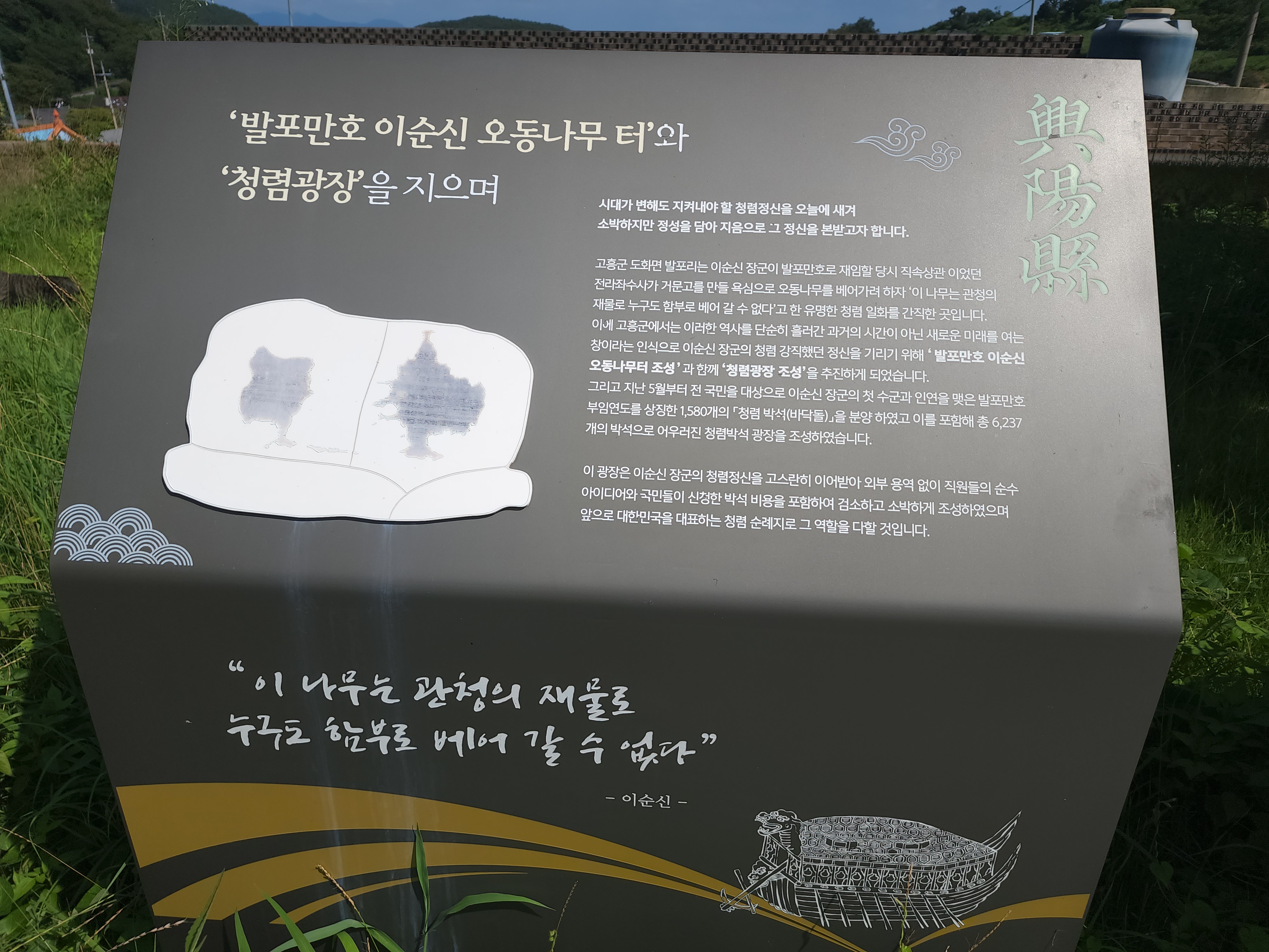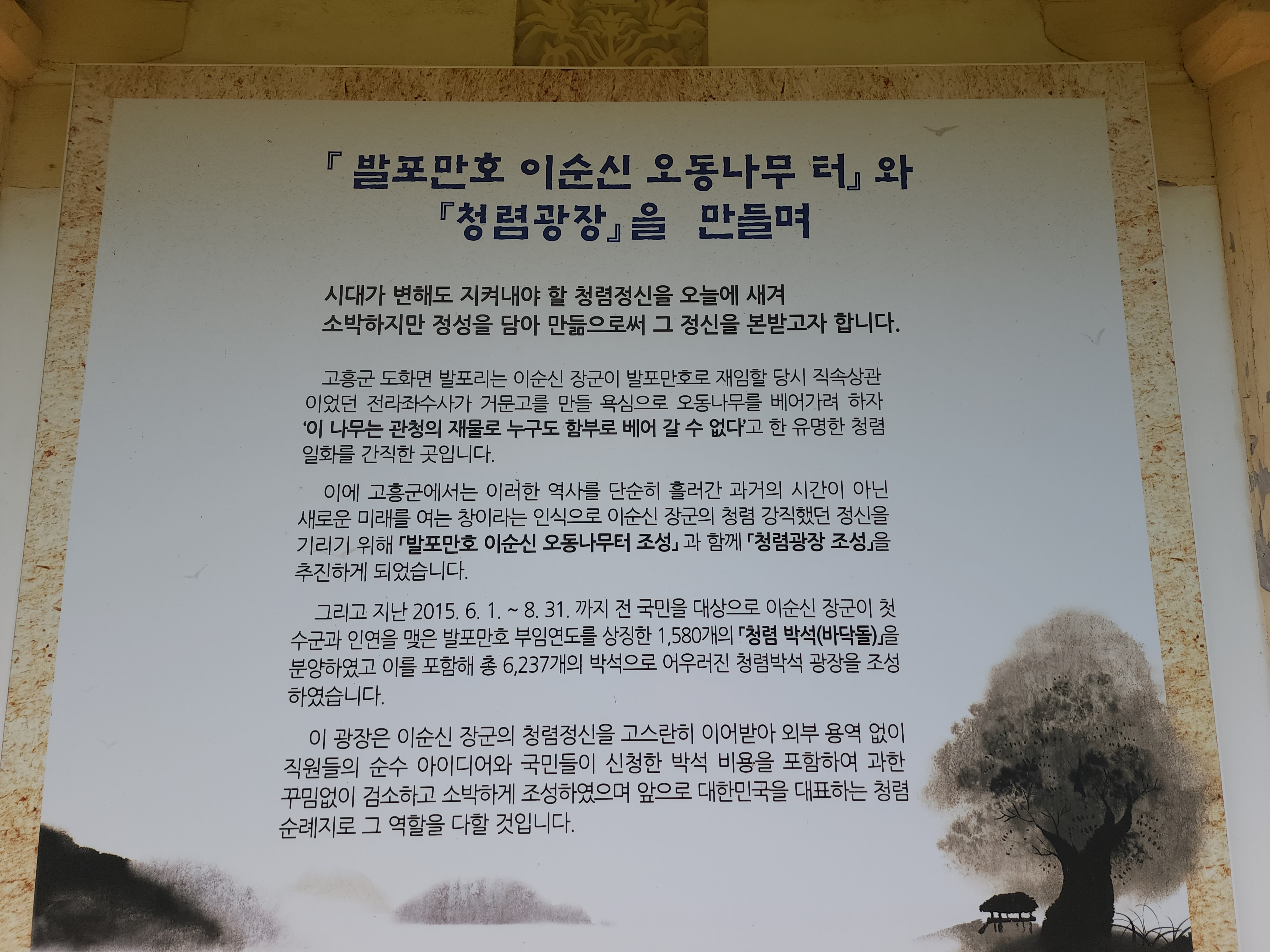 시대가 변해도 지켜내야 할 청렴정신을 오늘에 새겨 소박하지만 정성을 담아 발포만호 이순신 오동나무 터와 "청렴광장"을 지었다.