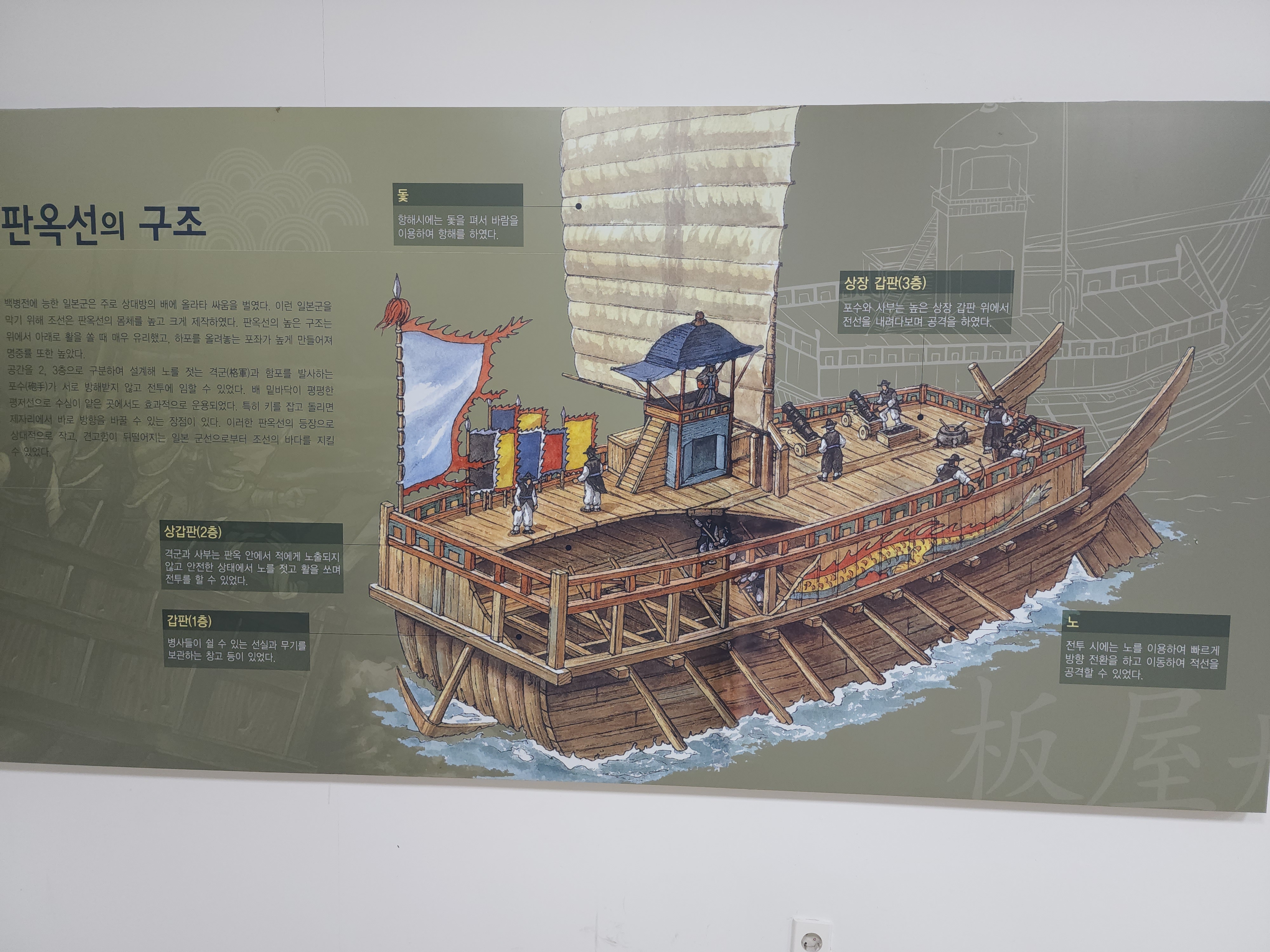 판옥선에 판목을 깔아 거북 등처럼 만들고 검은 칠을 했다. 적이 배 위에 올라 올 수 없도록 판자 위에 칼이나 송곳을 꽂았다. 전투 시에는 판자 위에 거적이나 이엉 같은 것을 씌워 적이 배에 올라와도 찔리도록 고안했다. 송곳 등이 꽂혀 있어 활동 공간이 좁은 갑판 위에는 대포와 활을 쏘는 군졸만을 소수 배치했다. 배 밑도 적이 쉽게 타고 올라오지 못하는 구조였다. 대포는 앞뒤에 한개씩, 양옆에 여섯 개씩 달았다. 공격할 때는 대포를 일제히 발사했다. 적의 배를 들이받아 산산조각을 냈다. 대포가 있는 아래층 판옥 안에 격군 20명을 배치해 3명씩 한 조가 되어 노를 젓도록 했다. 서서 저었기 때문에 앉아 젓는 것보다 훨씬 능률적이었다.