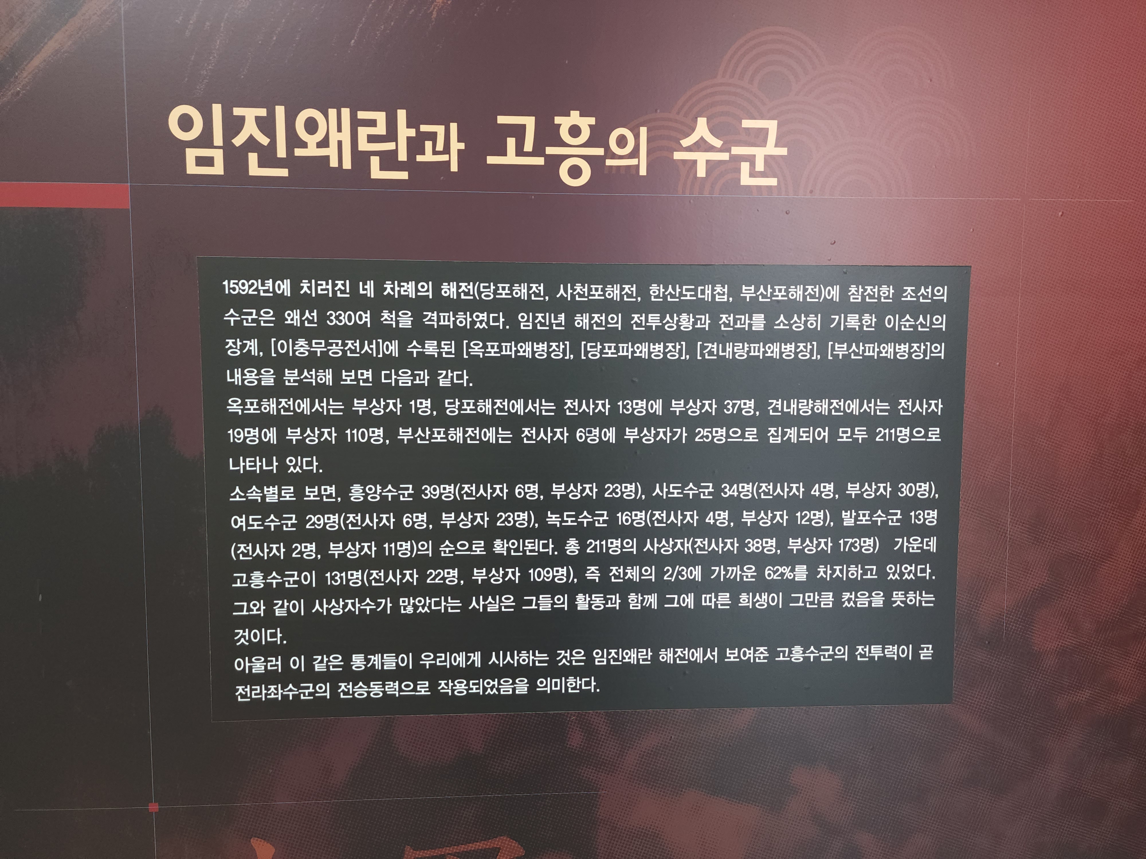 소속별로 보면 흥양수군 39명, 사도수군 34명, 여도수군 29명, 녹도수군 16명, 발포수군 13명의 순으로 확인된다. 총 211명의 사상자(전사자 38명, 부상자 173명) 가운데 고흥구순이 131명, 즉 전체의 2/3에 가까운 62%를 차지하고 있었다. 그와 같이 사상자수가 많았다는 사실은 그들의 활동과 함께 그에 따른 희생이 그만큼 컸음을 뜻하는 것이다. 아울러 이 같은 통계들이 우리에게 시사하는 것은 임진왜란 해전에서 보여준 고흥수군의 전투력이 곧 전라좌수군의 전승동력으로 작용되었음을 의미한다.