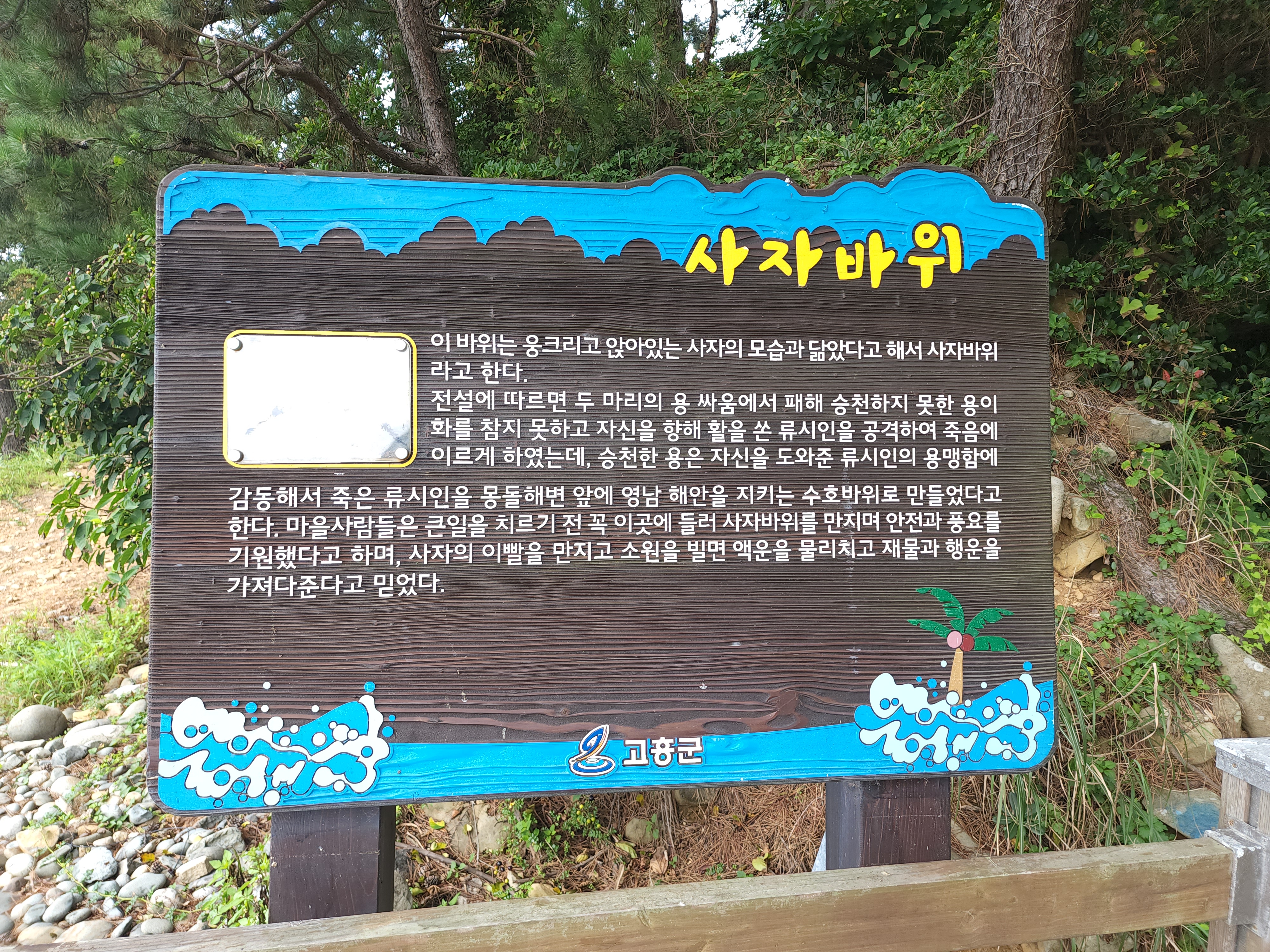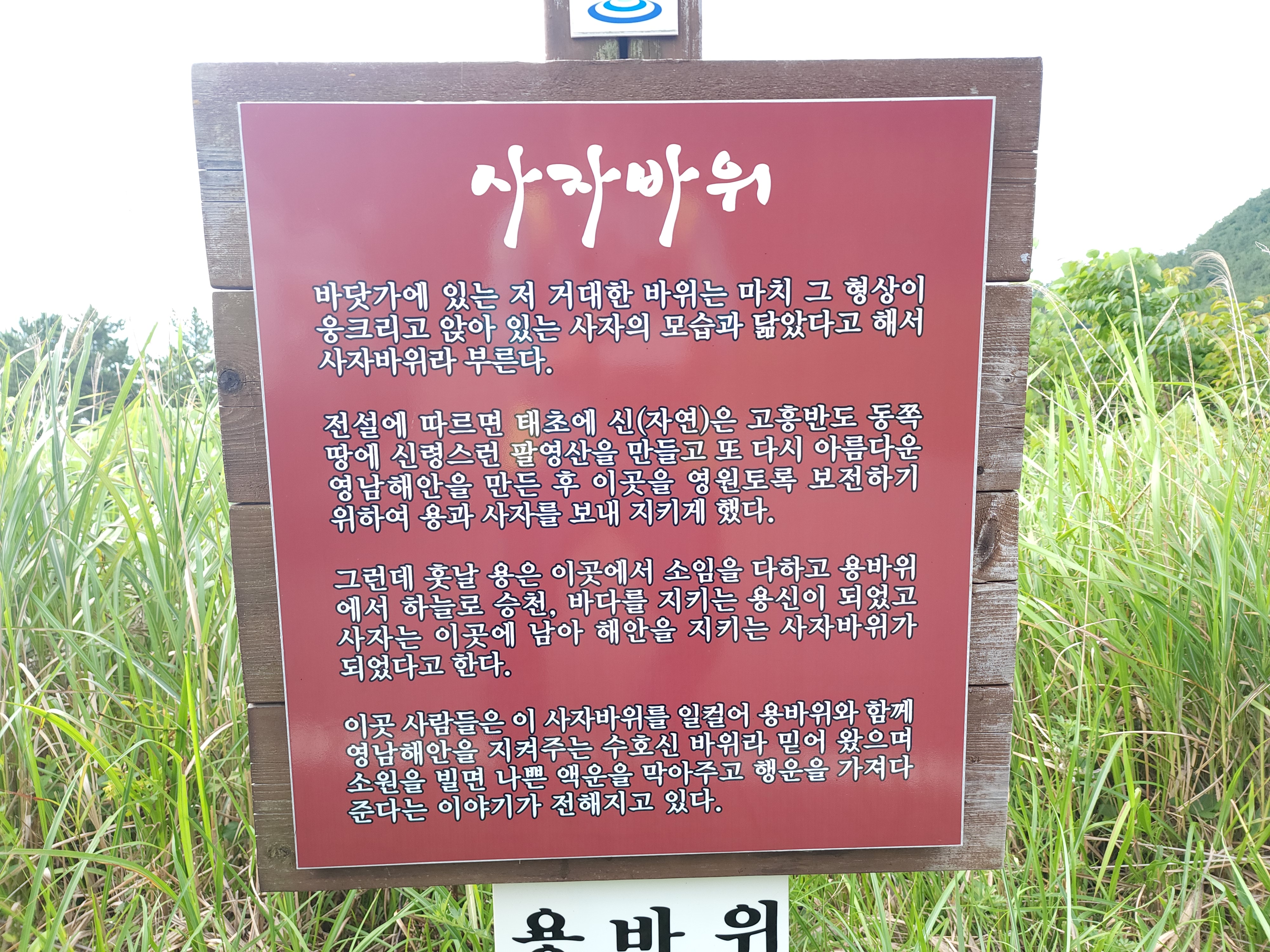 그런데 훗날 용은 이곳에서 소임을 다하고 용바위에서 하늘로 승천하고 바다를 지키는 용신이 되었고 사자는 이곳에 남아 해안을 지키는 사자바위가 되었다고 한다.