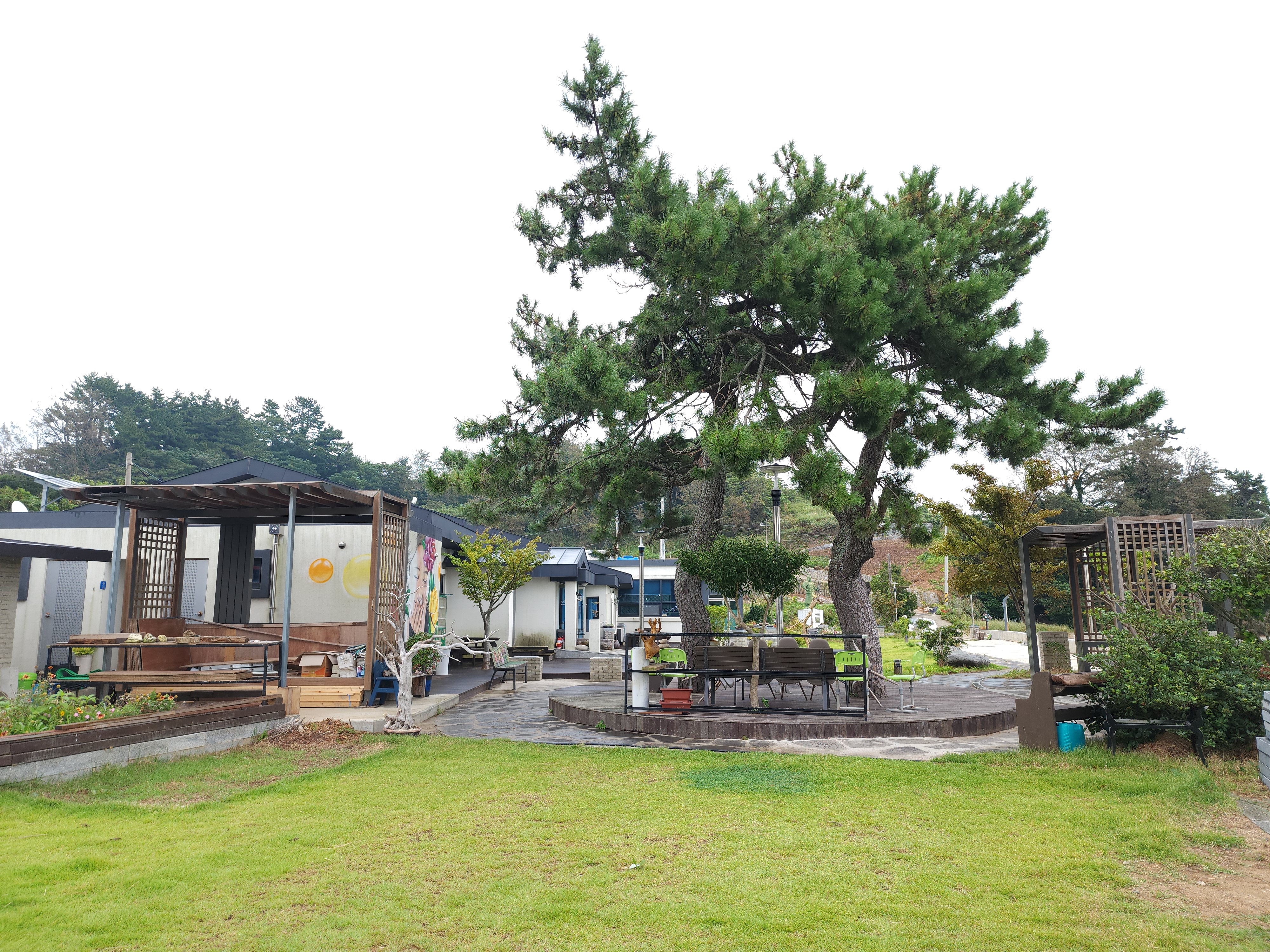 잔디가 심어져 있고 소나무와 쉼터가 있다.