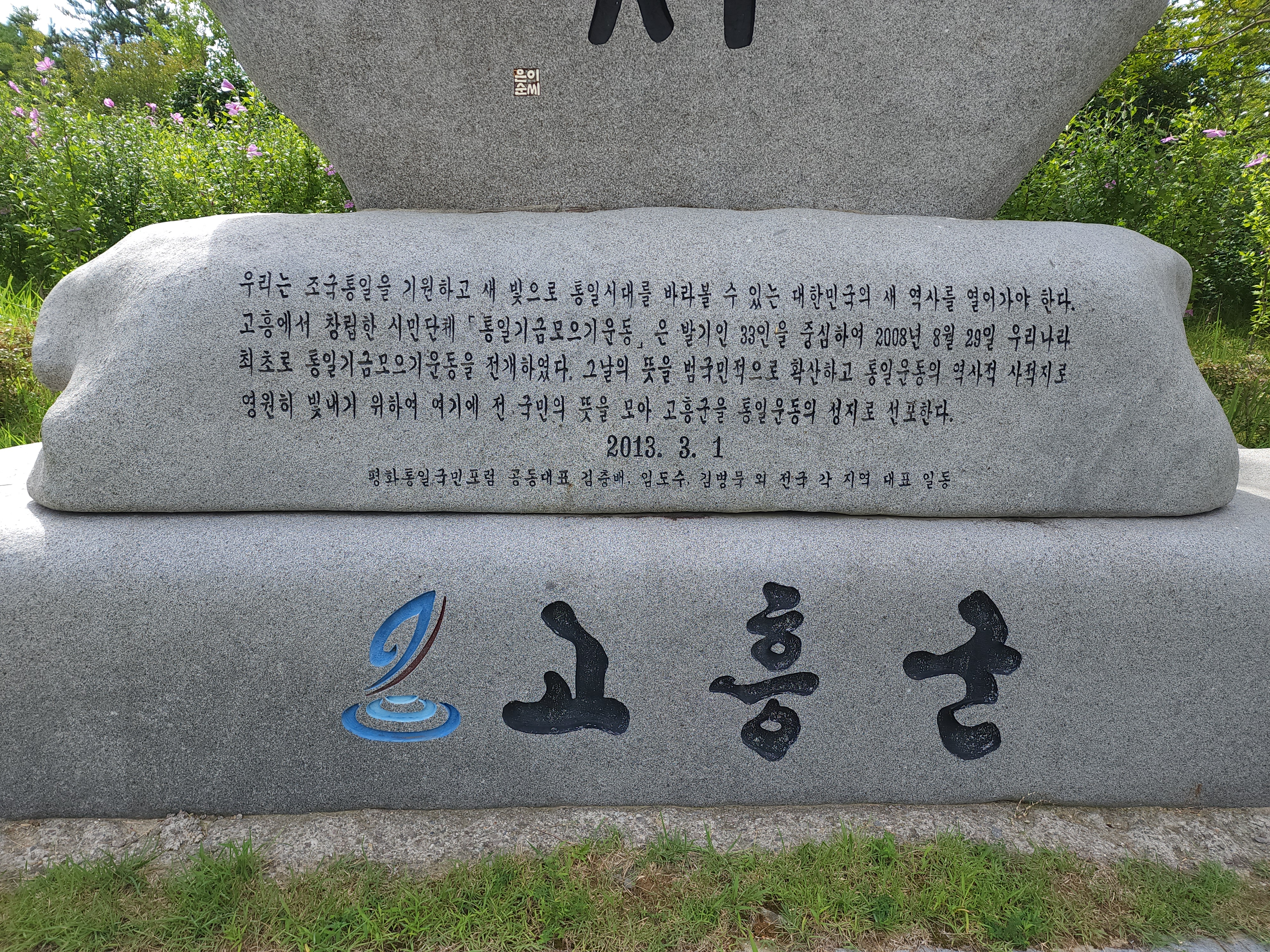 영원히 빛내기 위하여 여기에 전 국민의 뜻을 모아 고흥군을 통일운동의 성지로 선포한다. 2013.3.1.