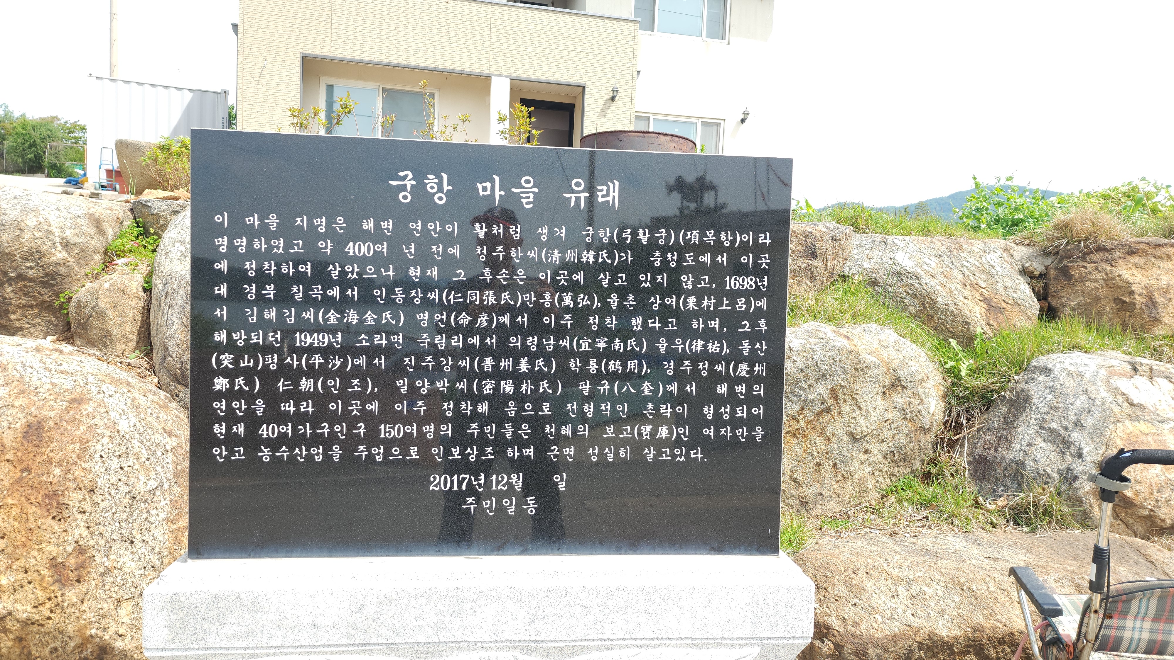 이 마을 지명은 해변 연안이 활처럼 생겨 궁항이라 명명하였고 약 400여 년 전에 청주이씨가 충청도에서 이곳에정착하여 살았으나 현재 그 후손은 이곳에 살고 있지 않고 1698년대 경북 칠곡에서 인동장씨 만홍, 율촌 상여에서 김해김씨 명언께서 이주 정착했다고 한다.
