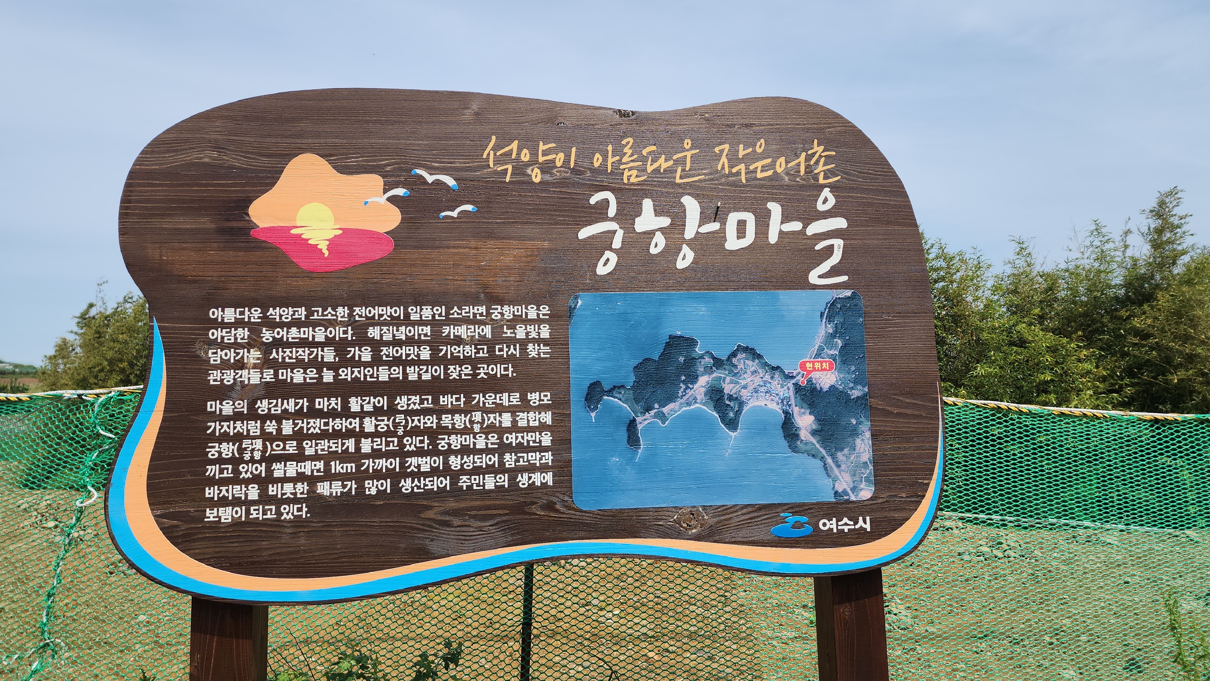 아름다운 석양과 고소한 전어맛이 일품인 소라면 궁항마을은 아담한 농어촌마을이다. 해질녘이면 카메라에 노을빛을 담아가는 사진작가들, 가을 전어맛을 기억하고 다시 찾는 관광객들로 마을은 늘 외지인들의 발길이 잦은 곳이다.