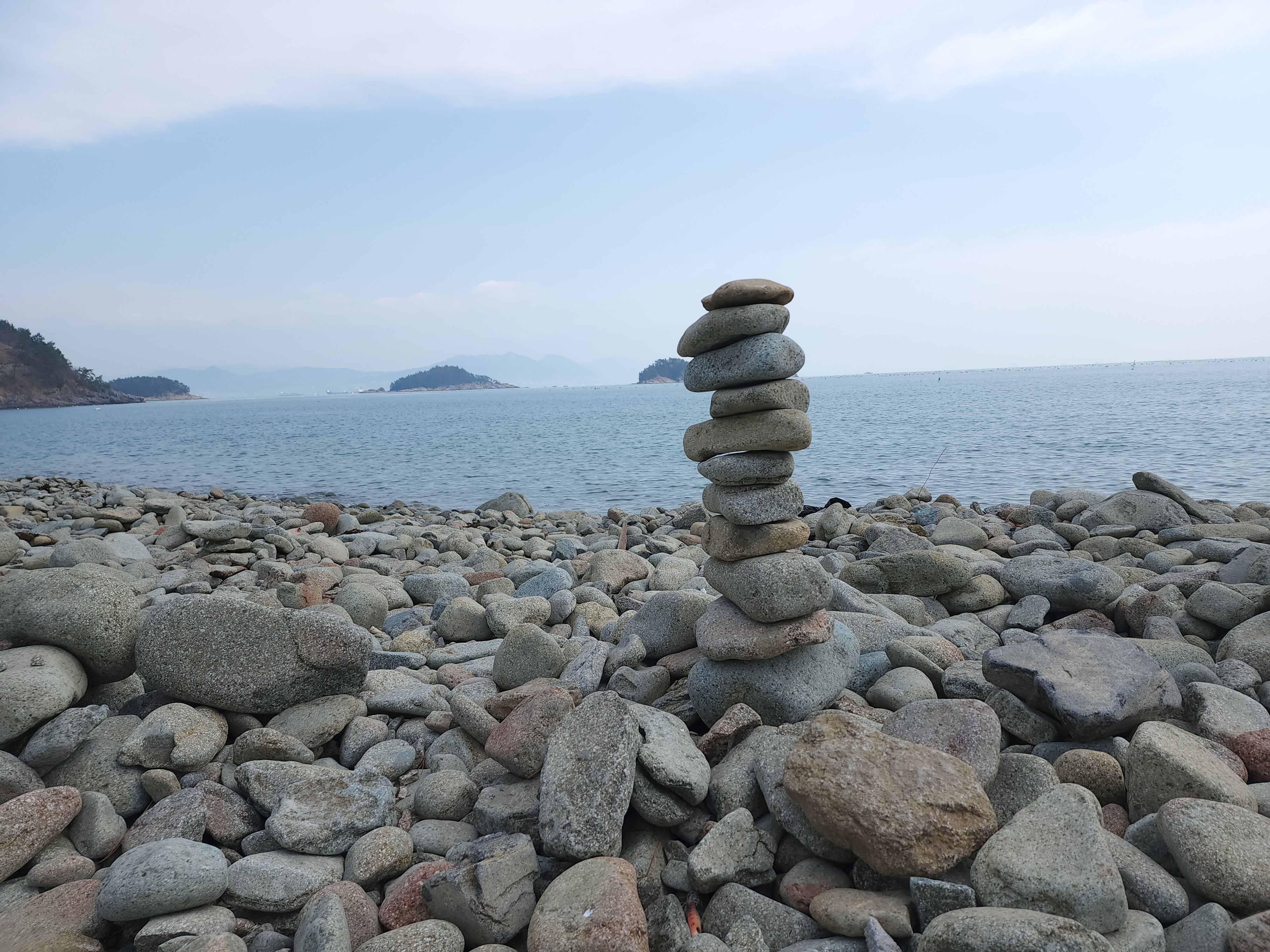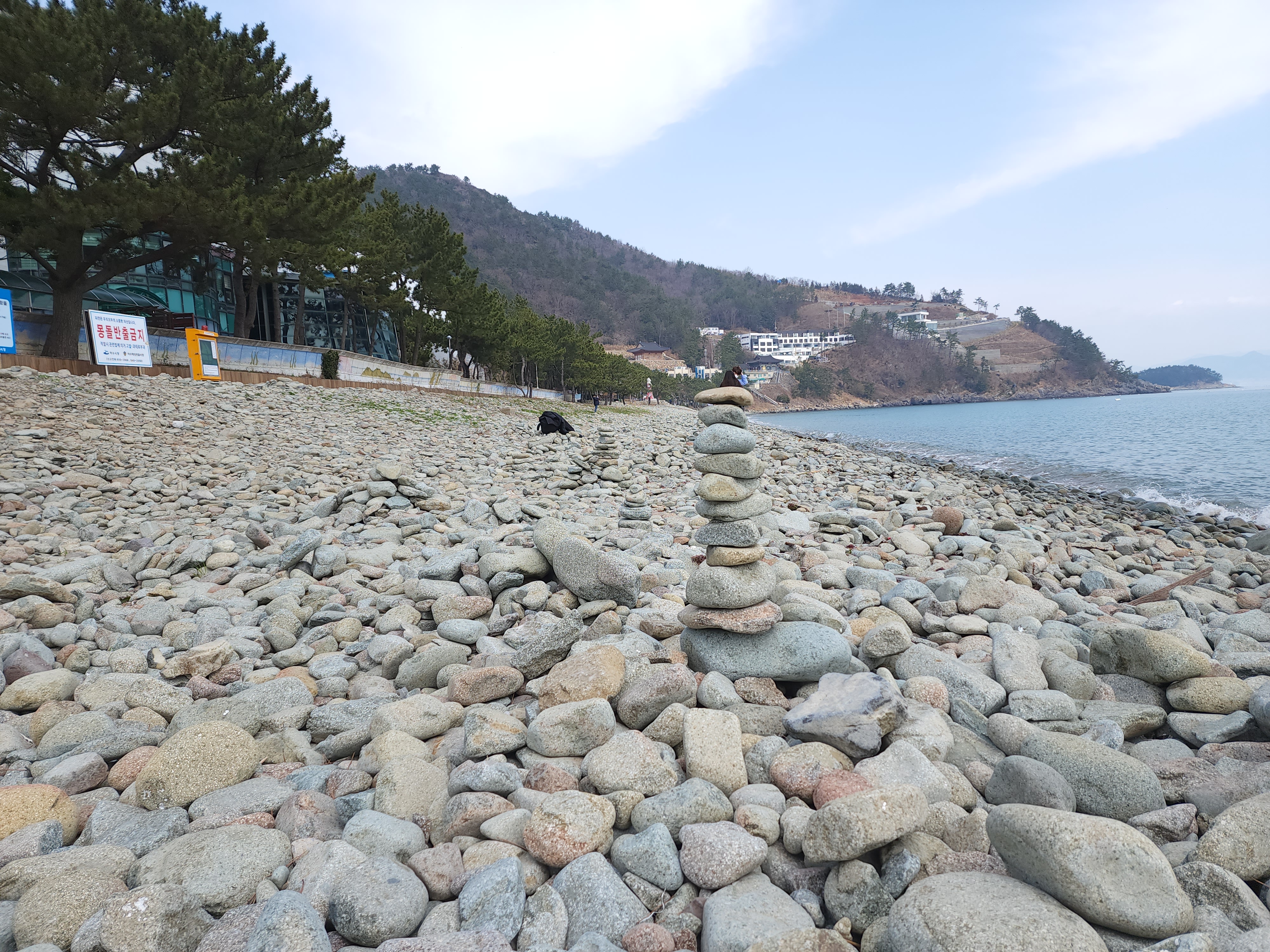 몽돌이 큰편이어서 돌탑쌓기를 해놓은 흔적이 여려곳에 보인다.