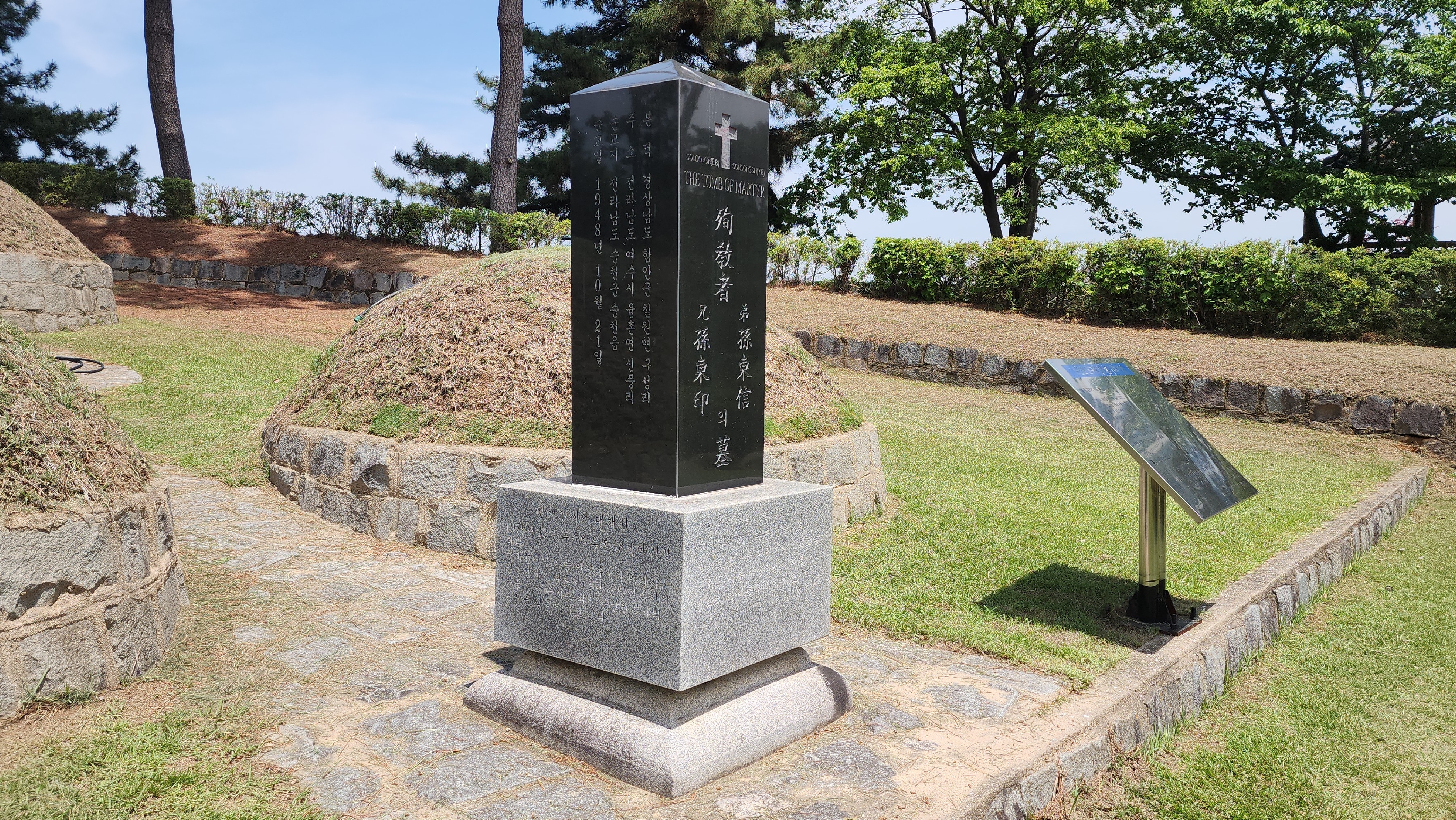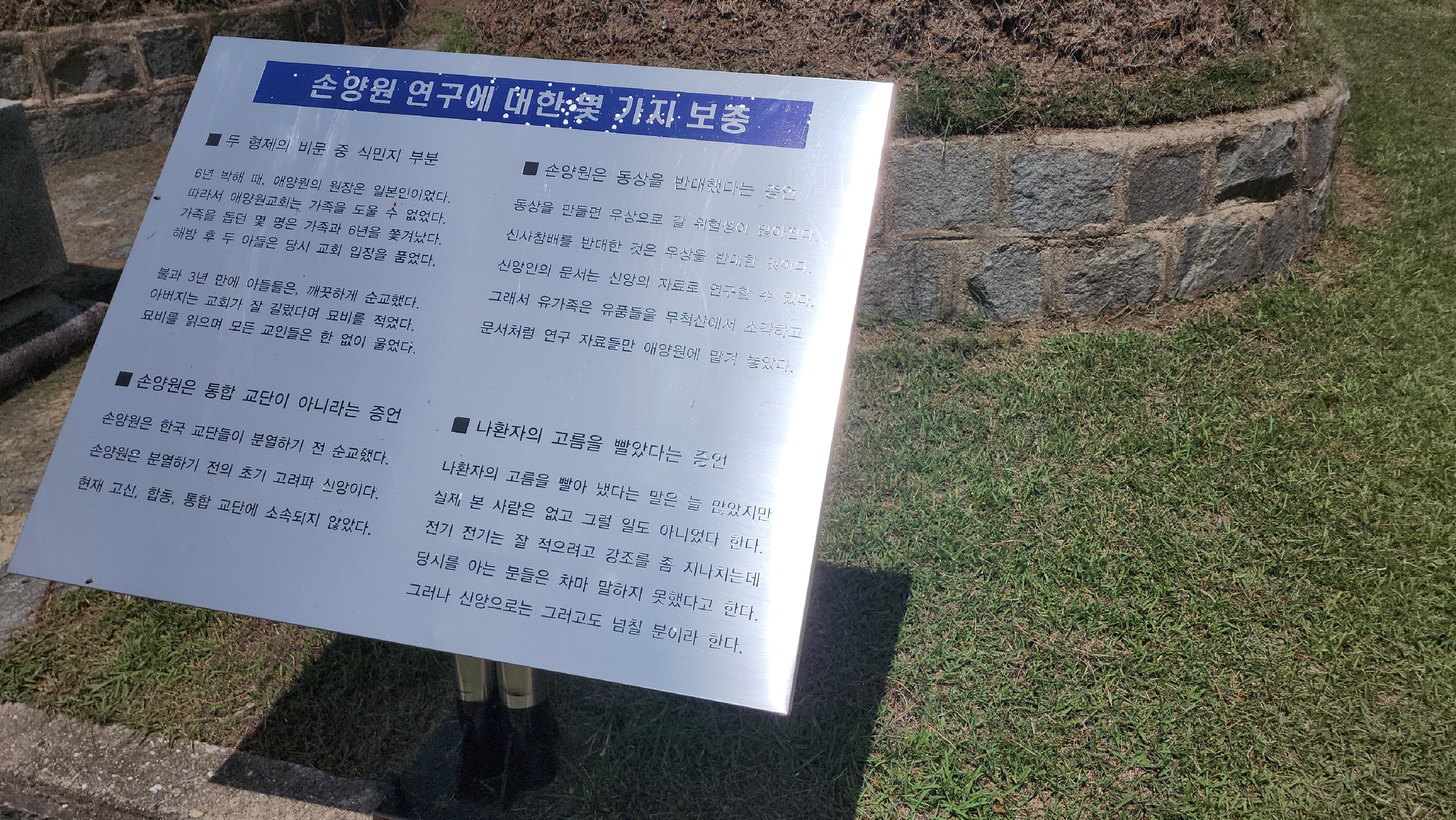 손양원목사님과 정양순사모는 한묘에 합장을 했고 아래 두 아들 손동인과 손동신의 묘가 있다.