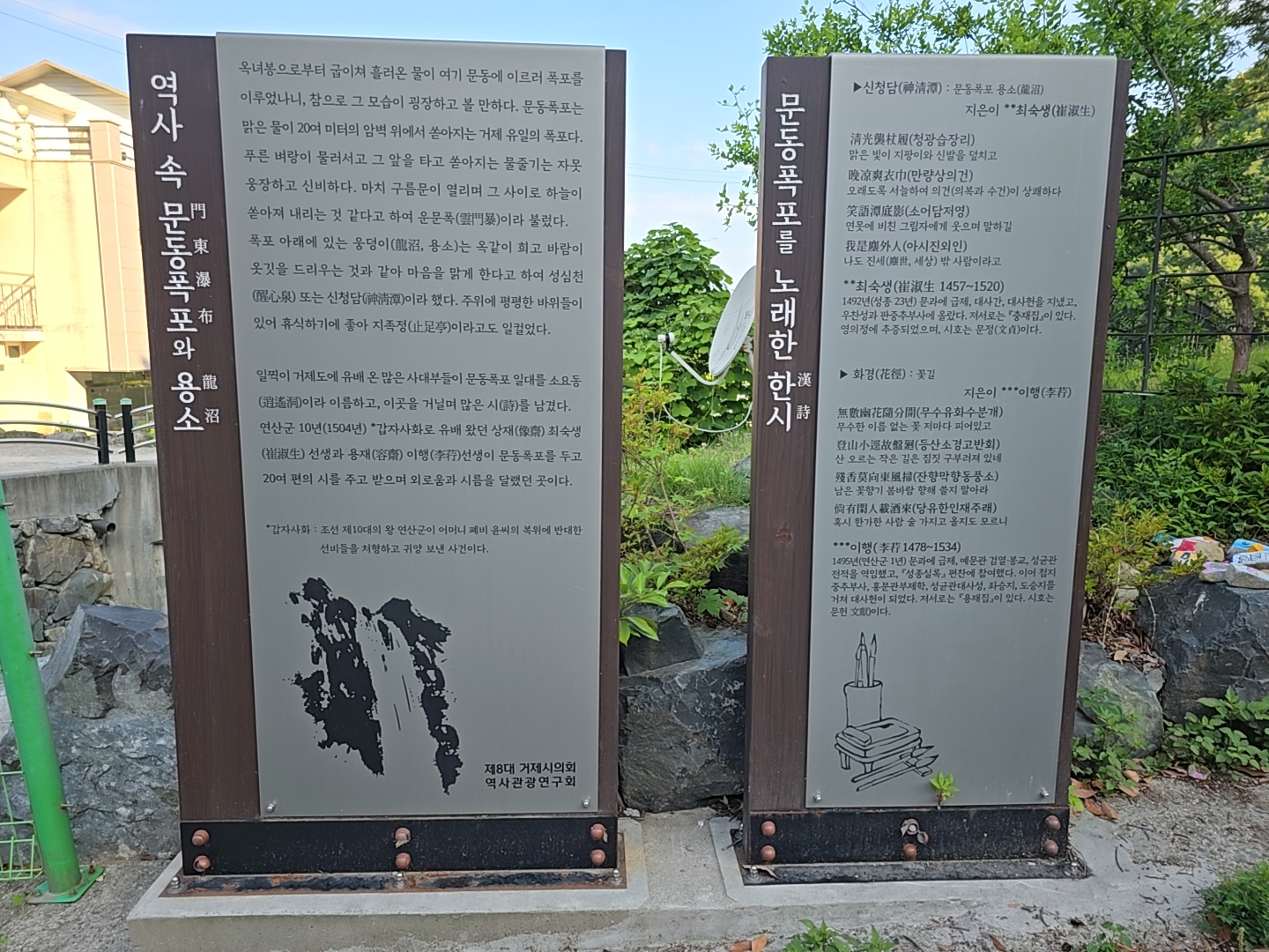 연산군 10년(1504) 갑자사회로 유배 왔던 상재 최숙생선생과 용재 이행 선행이 문동폭포를 두고 20여 편의 시를 주고 받으며 외로움과 시름을 달랬던 곳이다.