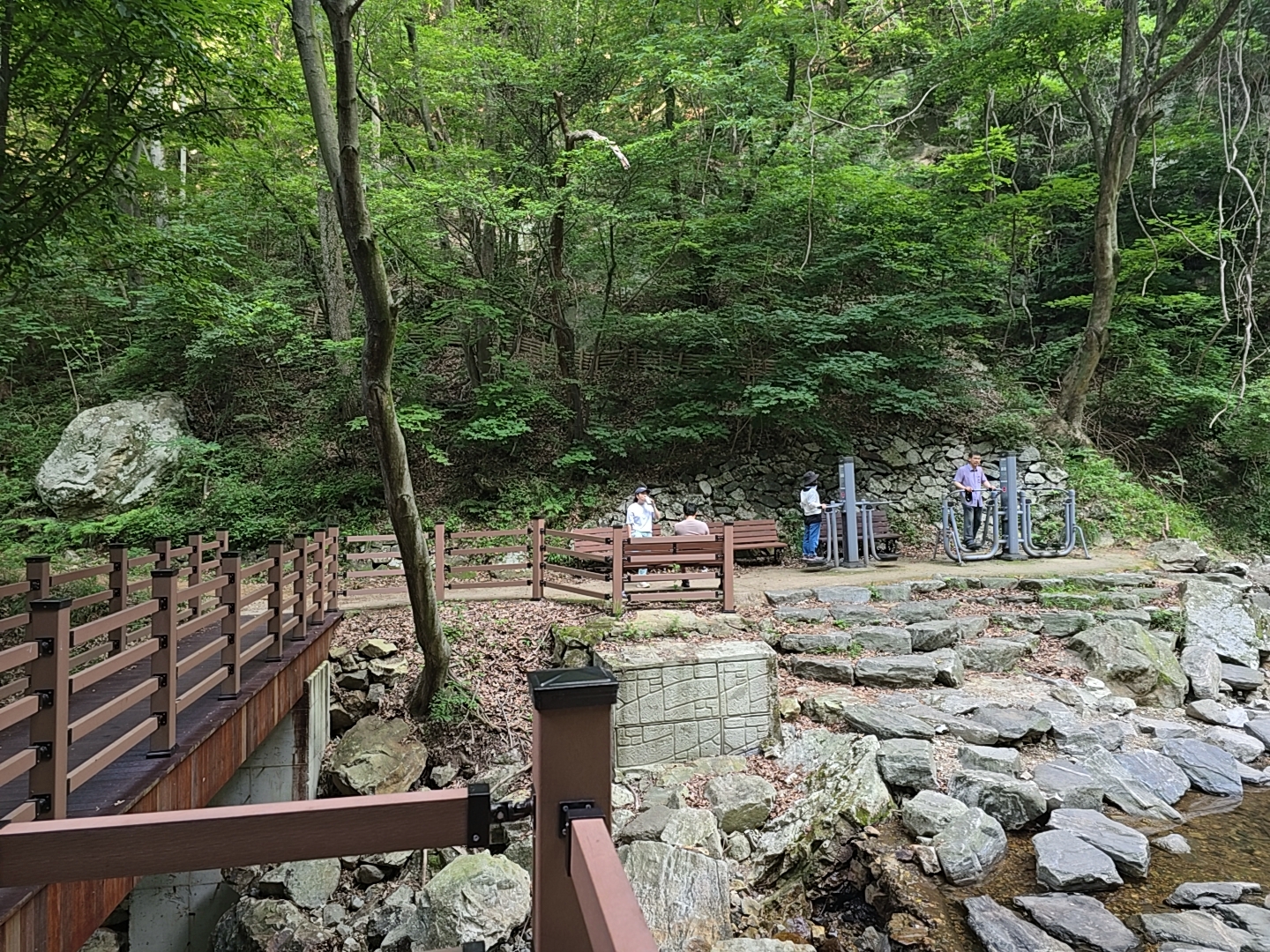 문동폭포 앞 다리 앞에는 운동기구들이 있어서 많은 사람들이 이용하고 있다.