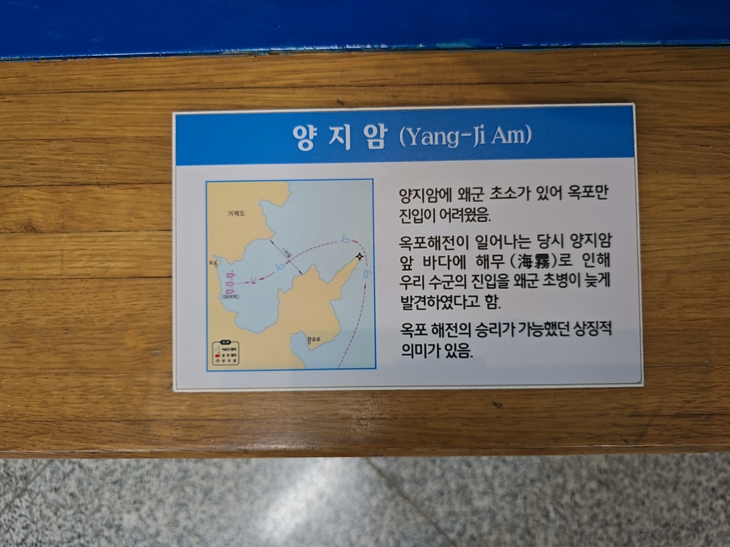 양지암에 왜군 초소가 있어 옥포만 진입이 어려웠다. 옥포해전이 일어나는 당신 양지암 앞 바다에 해무로 인해 우리 수군의 진입을 왜군 초병이 늦게 발견하였다고 한다.