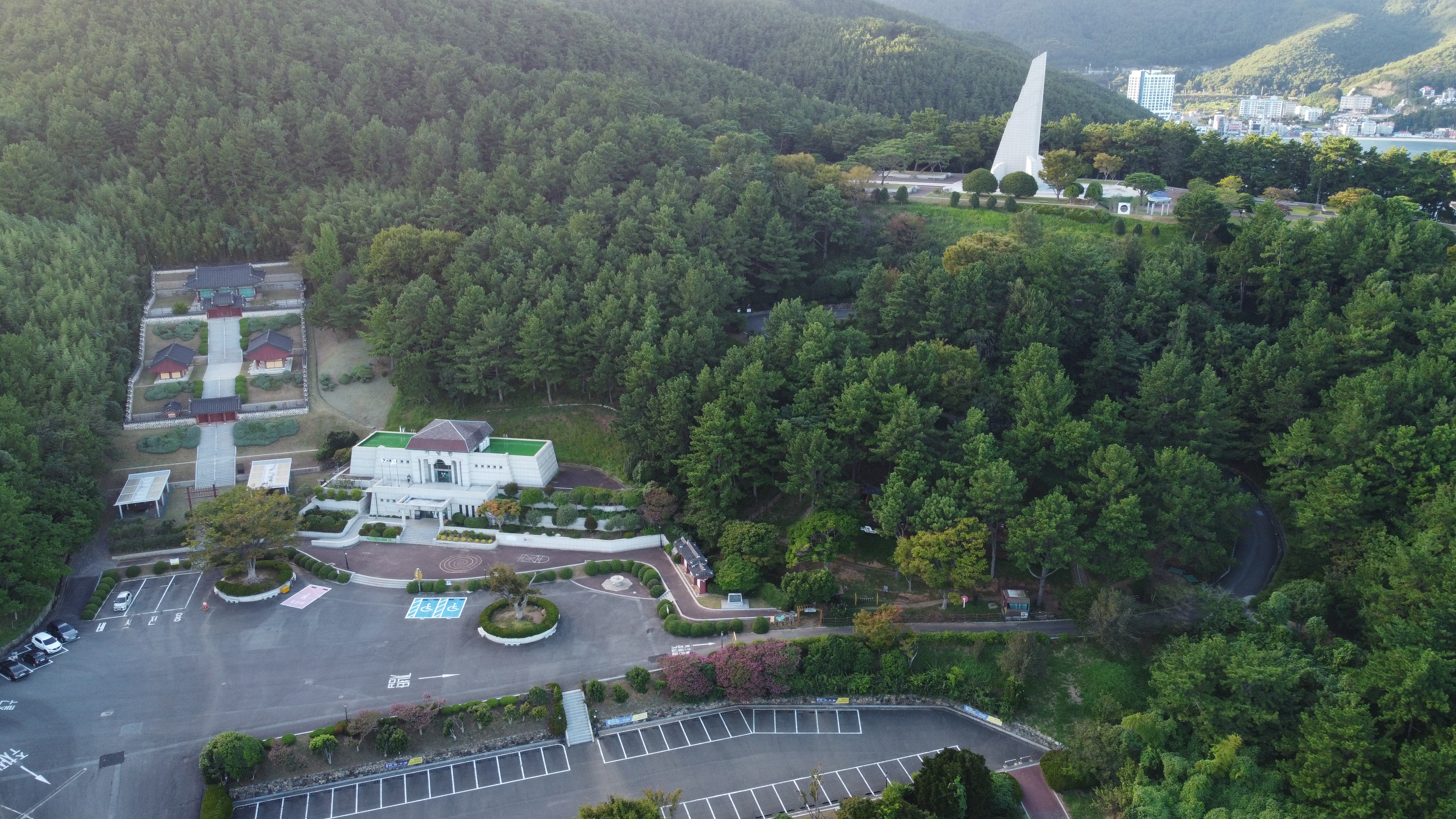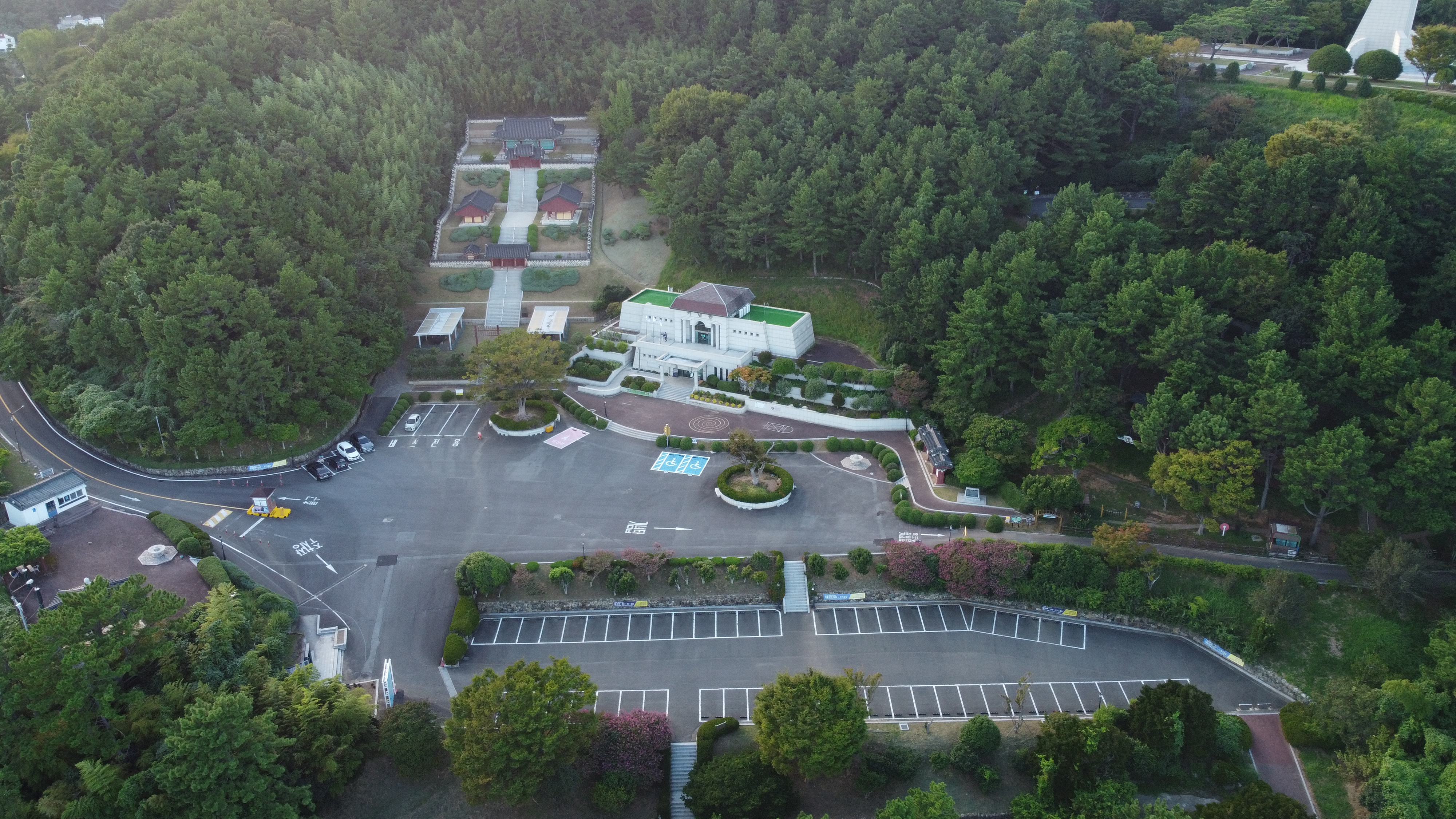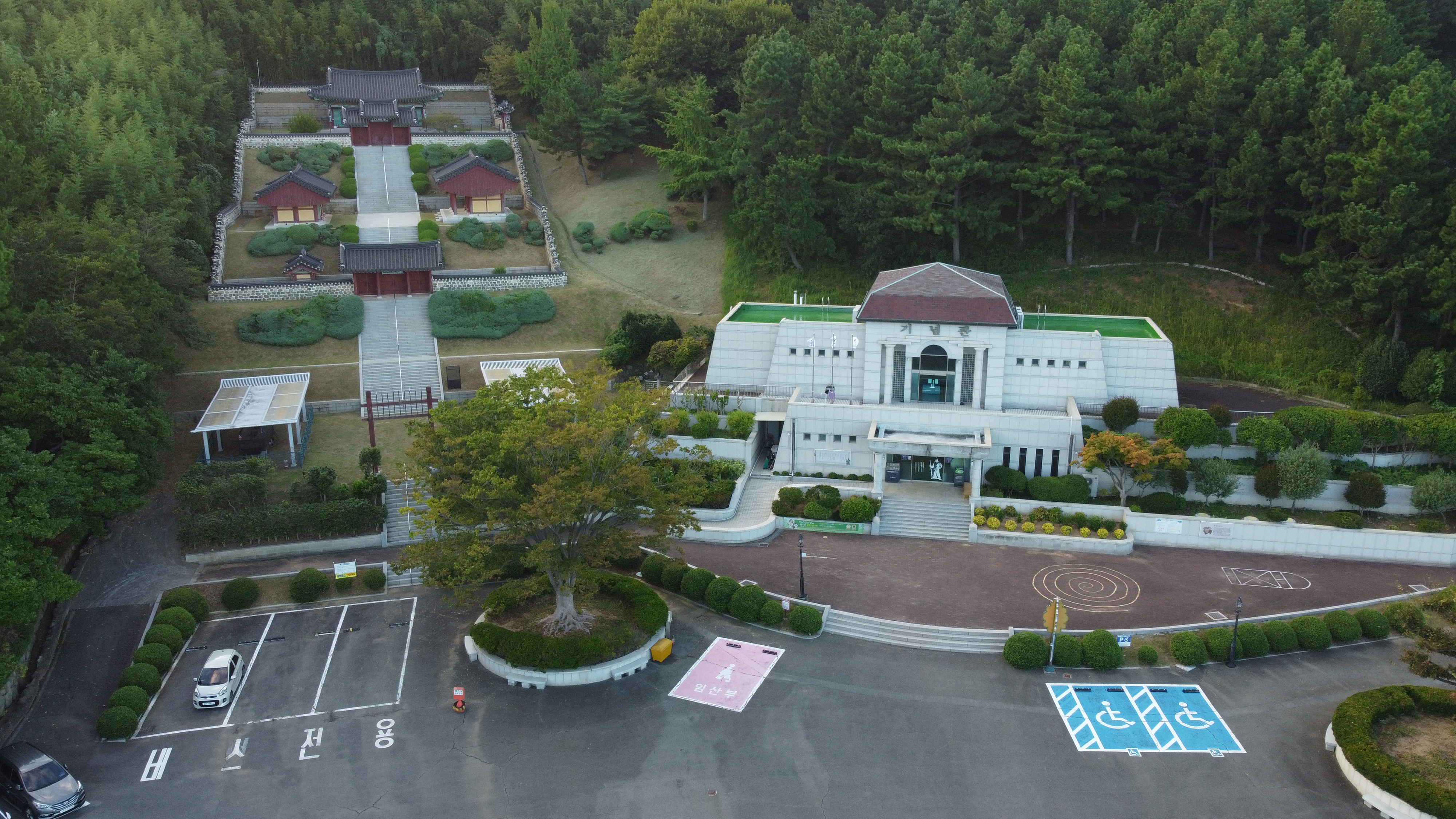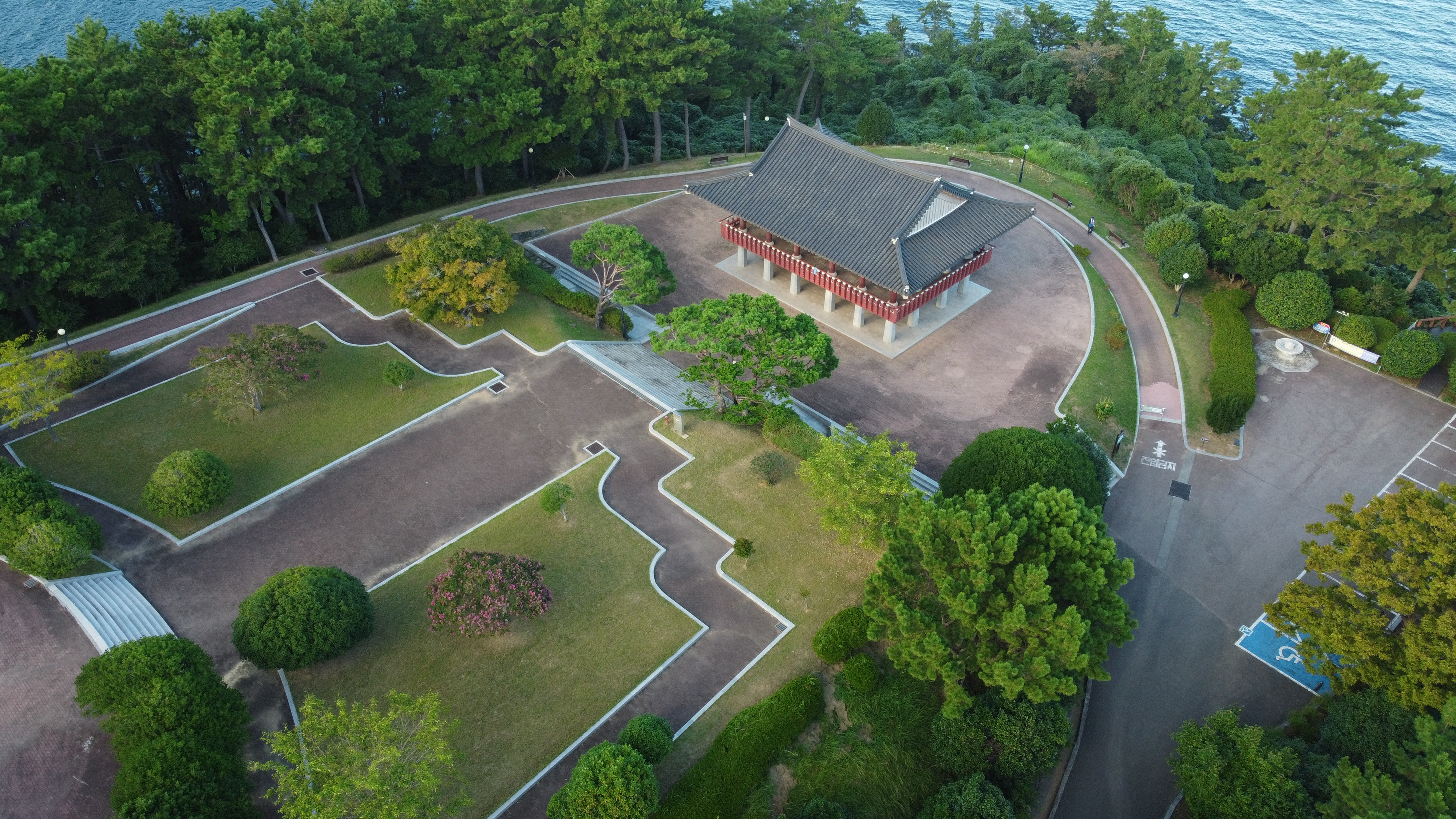 거제 옥포대첩기념공원 왼쪽에는 영정을 모신 사원이 있고 오른쪽에는 옥포대첩기념관이 있다.