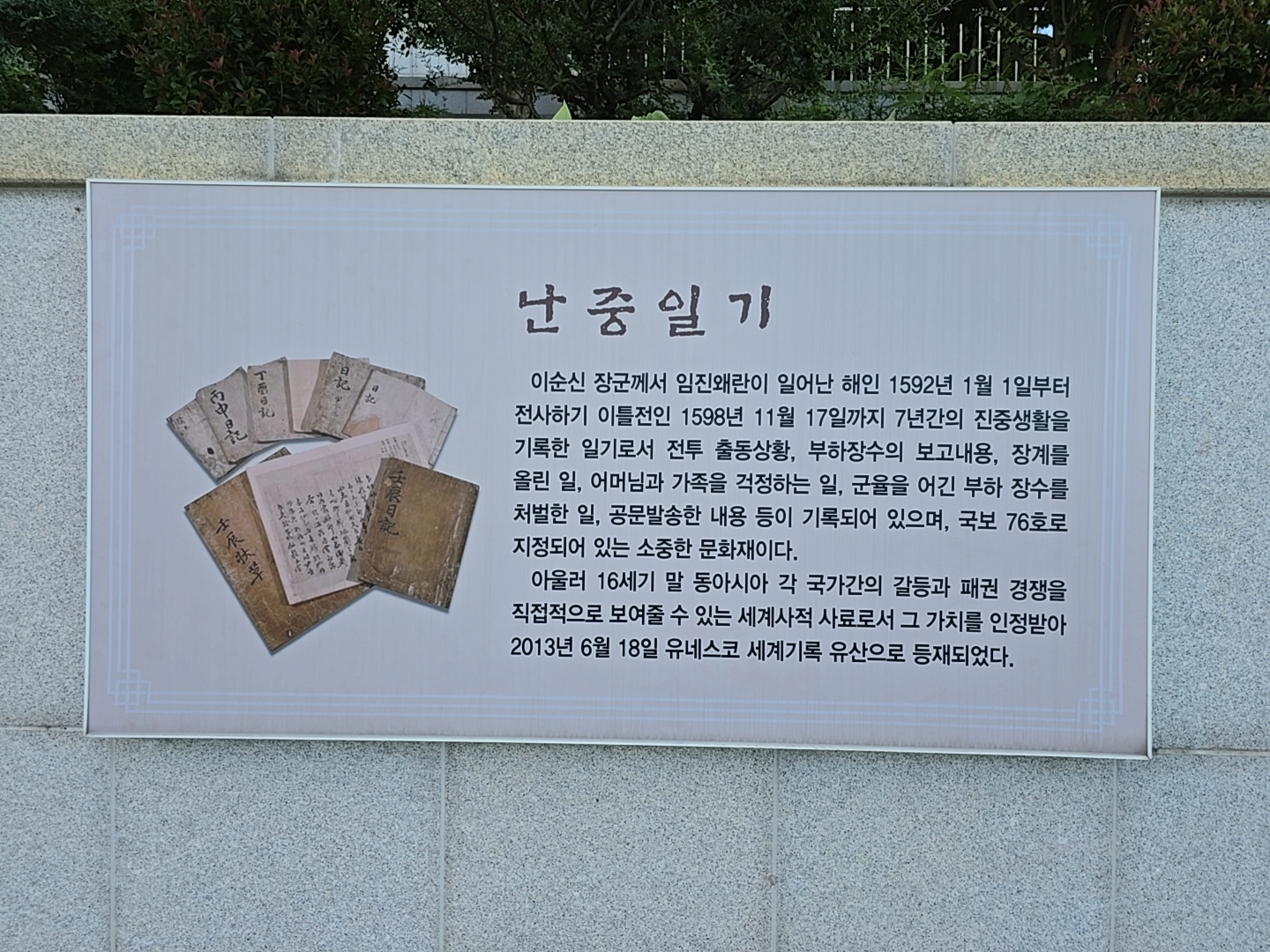 난중일기는 이순신 장군께서 임진왜란이 일어난 해인 1592년 1월 1일부터 전사하기 이틀전인 1598년 11월 17일까지 7년간의 진중생활을 기록한 일기로서 전투 출동상황, 부하장군의 보고내용, 장계를 올린 일, 어머님과 가족을 걱정하는 일, 군율을 어긴 부하 장수를 처벌한 일, 공문발송한 내용 등이 기록되어 있으며 국보 76호로 지정되어 있는 수중한 문화재이다.