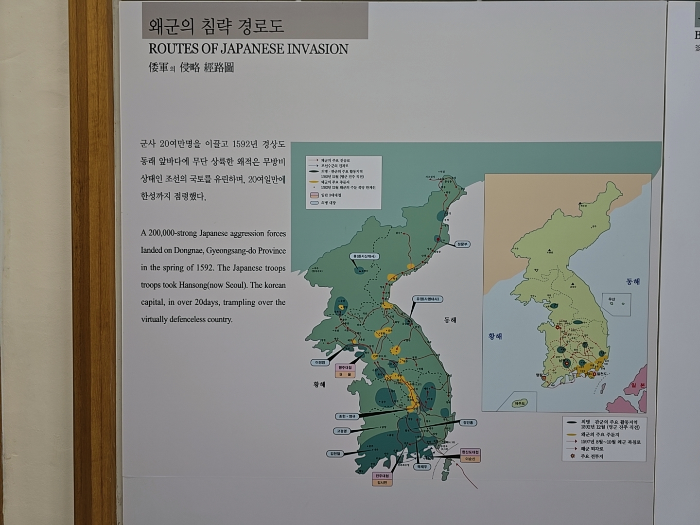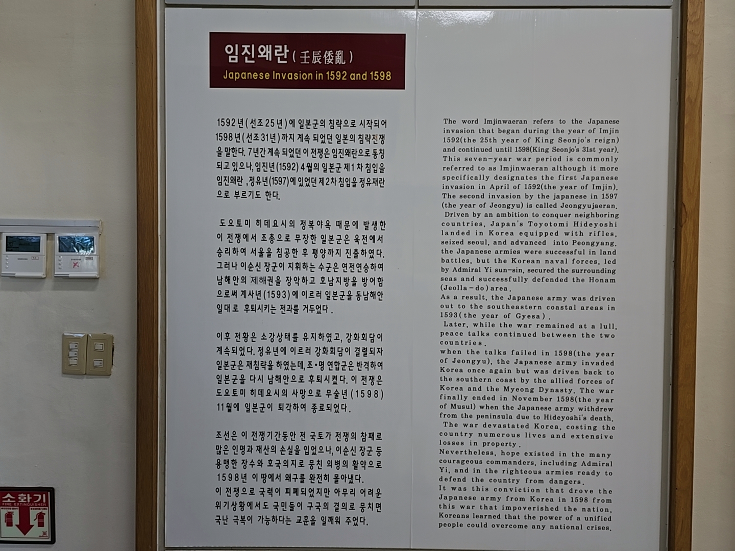 도요토미 히데요시의 정복야욕때문에 발생한 이 전쟁에서 조총으로 무장한 일본군은 육전에서 승리하여 서울을 침공한 후 평양까지 진출하였다. 그러나 이순신 장군이 지휘하는 수군은 연전연승하여 남해안의 제해권을 장악하고 호남지방을 방어함으로써 계사년(1593)에 이르러 일본군을 동남해안 일대로 후퇴시키는 전과를 거두었다.