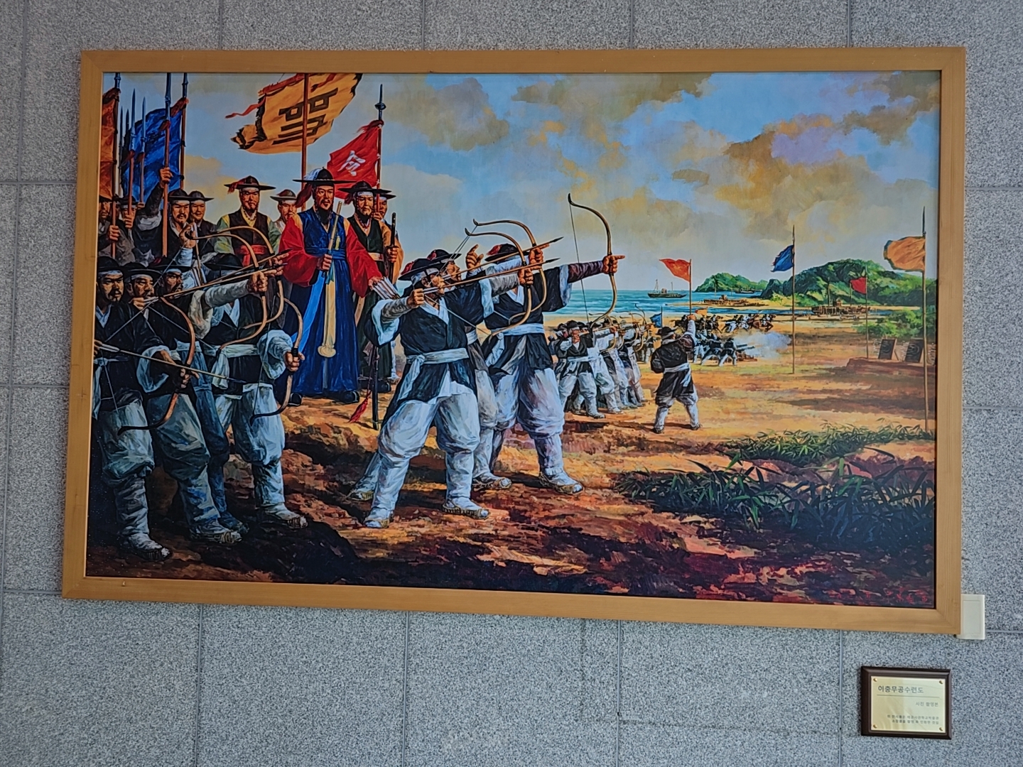 이순신장군이 수군들의 훈련하는 곳을 시찰하고 있는 그림이다.