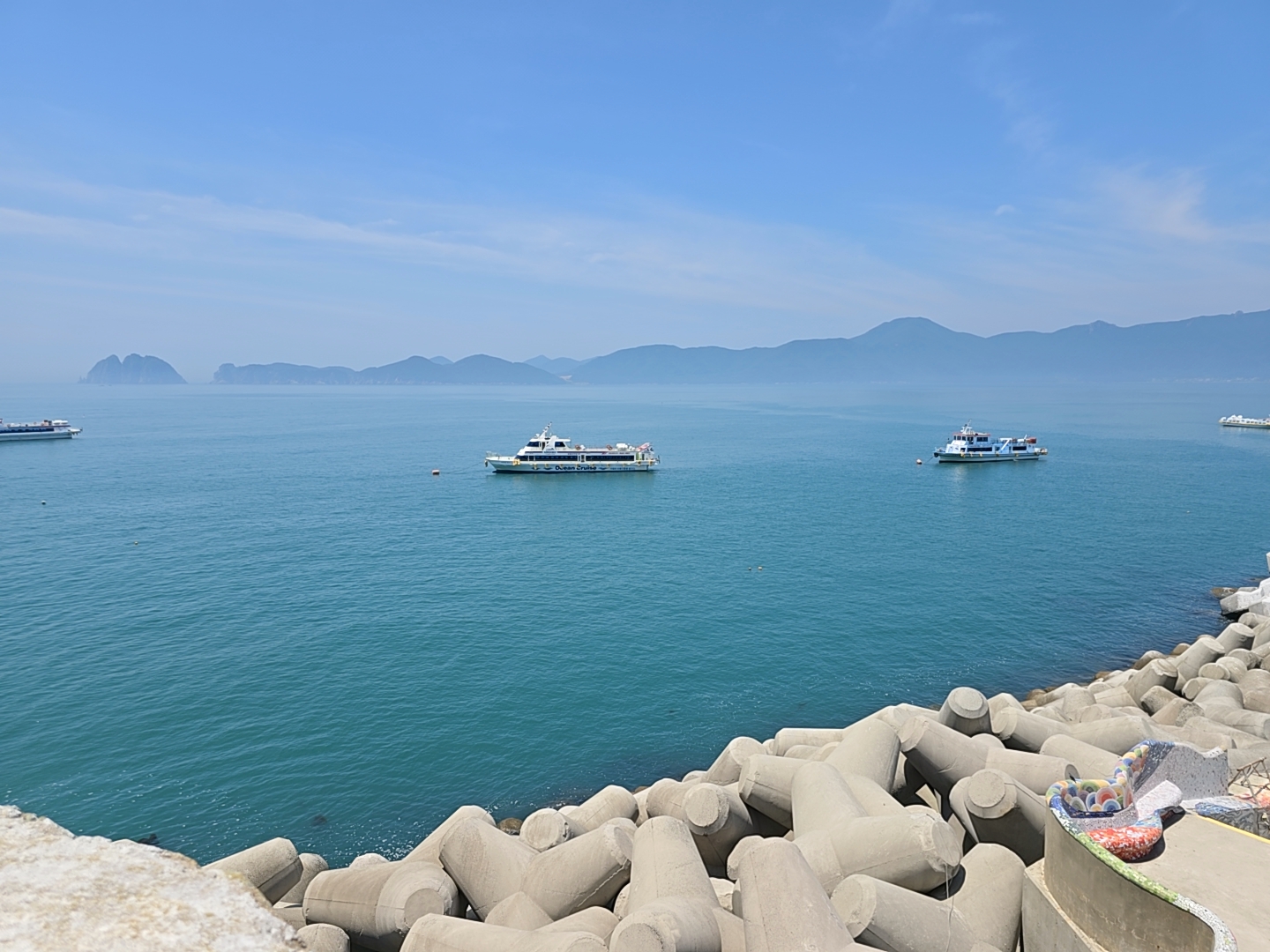 외도 보타니아를 구경하고 내려왔는데 여러척의 유람선들이 손님들을 내려주고 기다리면서 밖에서 기다리고 있다.