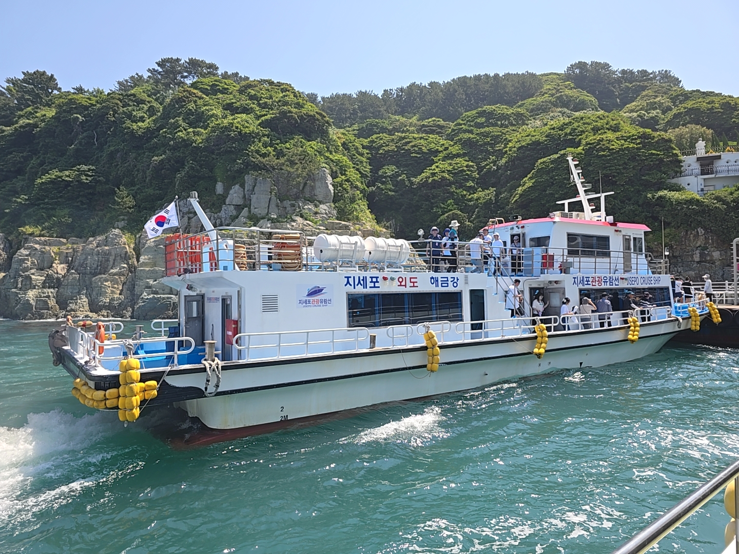 유람선을 타고 거제 해금강을 본후에 외도로 가고 있다.