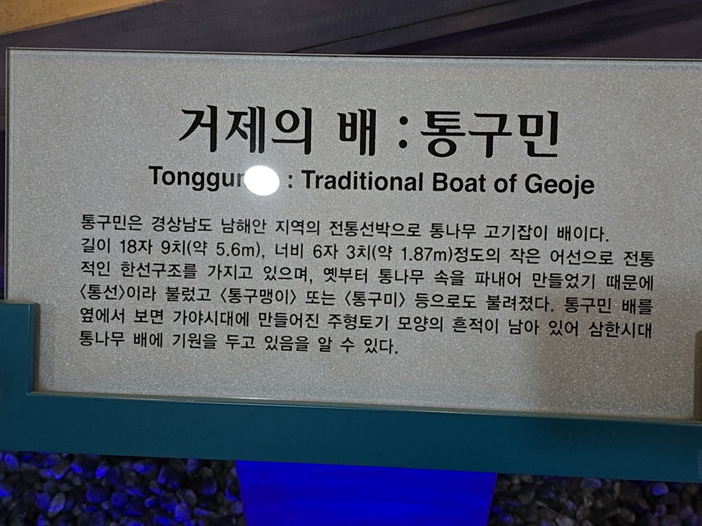 통구미배는 경남 남해안 지역에서 고기잡이에 사용한 독특한 배로, 원래 통나무 속을 파내 만든 것으로 전통적인 한선 구조를 갖추었다. 우리의 전통 선박인 한선은 우리나라 해안의 지형조건에 맞게 발전되어 온 것으로 중국이나 서양의 배와는 크게 다르다. 가장 독특한 것은 썰물 때 갯벌에 편하게 내려앉을 수 있도록 상판을 겹으로 이어가며 만들고, 군선의 이물비우를 제외하고는 모든 배의 이물비우와 고물 비우에 가로 방향으로 상판을 대 평평하면서도 뭉툭한 사각 모양을 띤다. 이와 같은 구조는 종류와 연대 에 상관없이 모두 비슷하며, 전통 어선의 경우도 동일하다. 전시관 내에는 전통 어선의 제작 과정 설명 과 함께 그림으로 상세하게 보여주고 있다.
