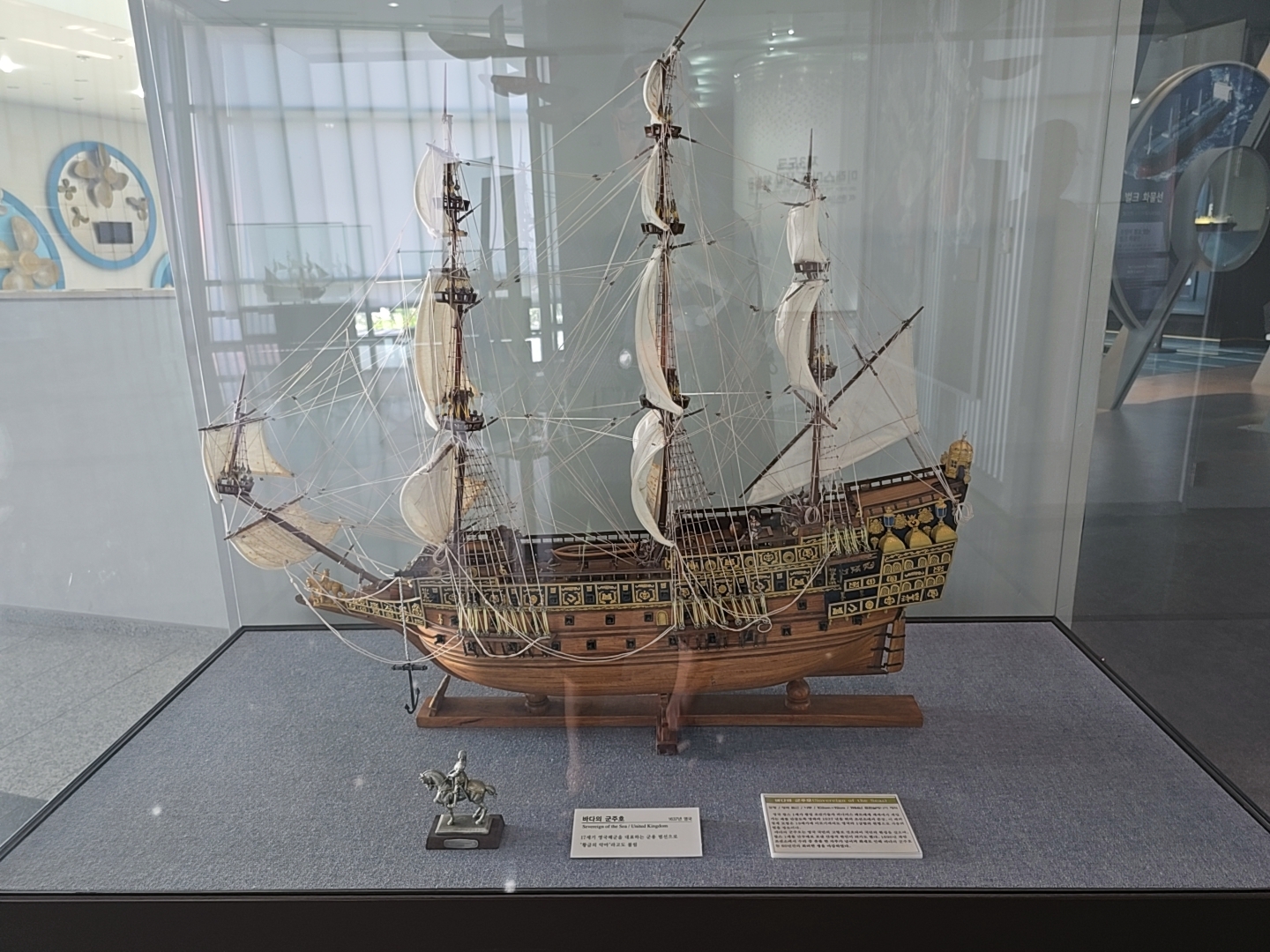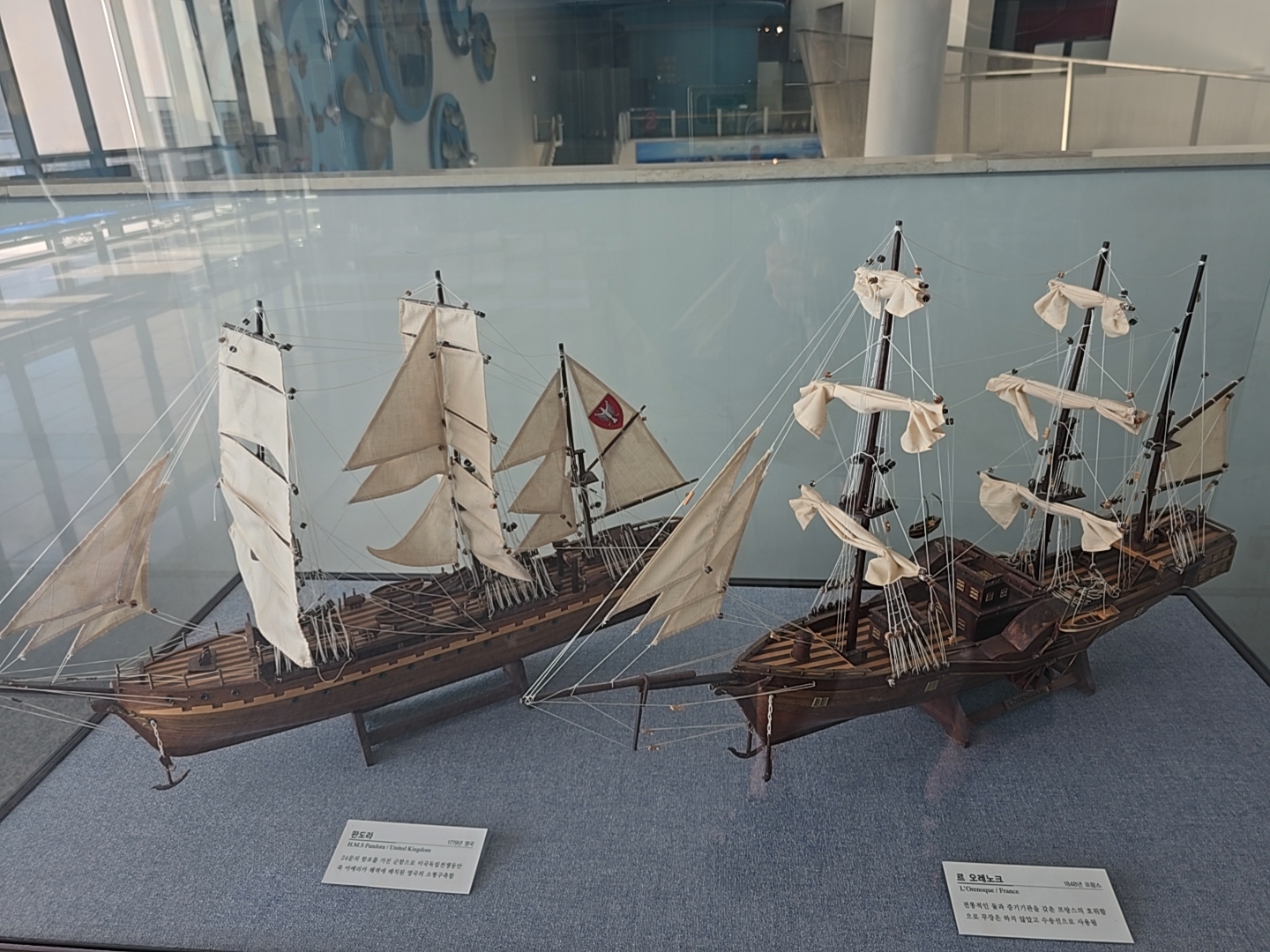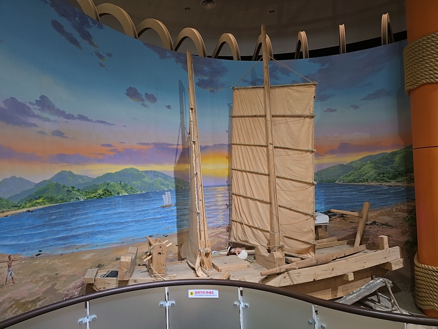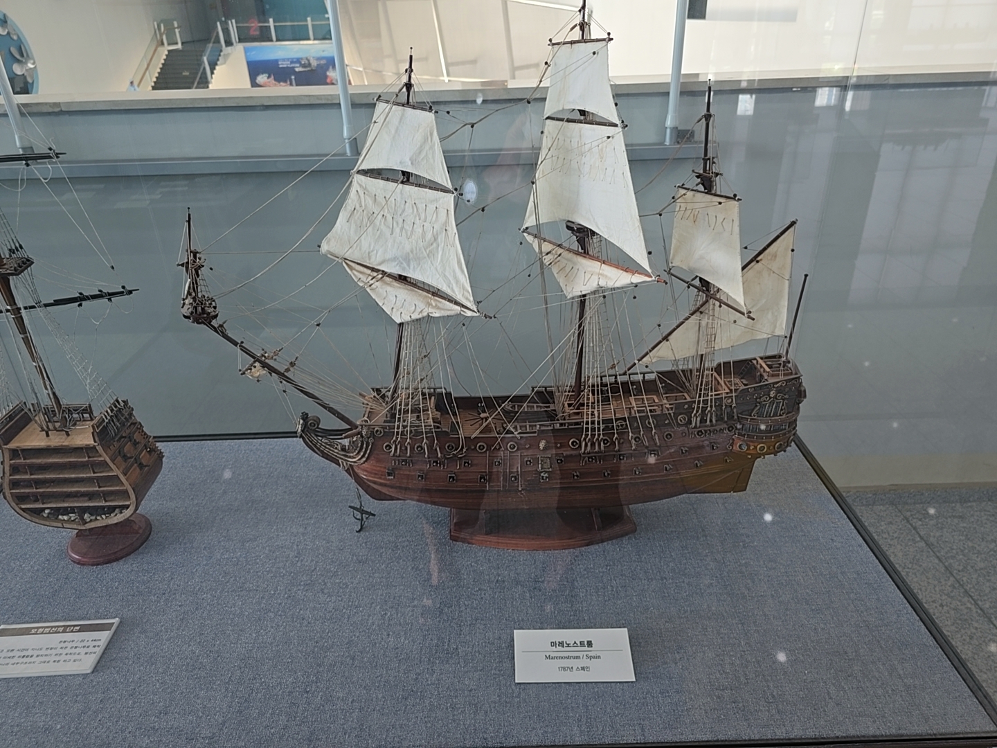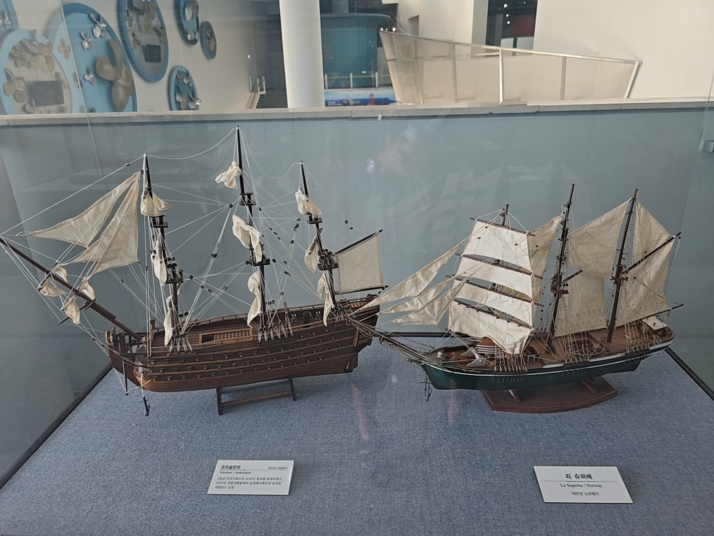 거제조선해양문화관 2관 2층에 먼저 올라왔는데 2층 입구에는 과거와 현대의 배 조형물들이 전시되어 있었다.