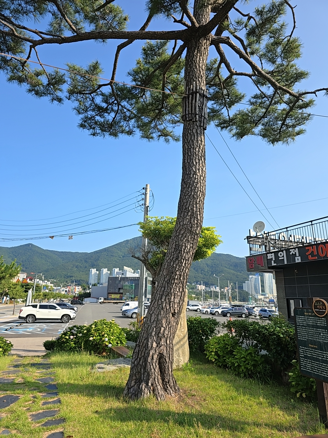 지세포항 여객선 뒤에는 지세포공원이 있고 이 공원에는 총맞은 나무가 있다.