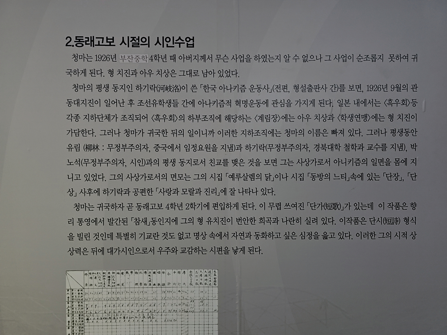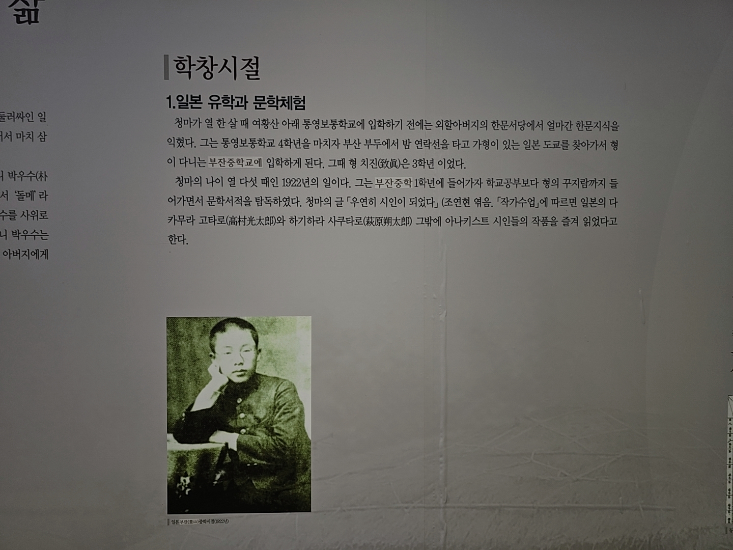 청마의 나이 열 다섯 때인 1922년의 일이다. 그는 부잔중학 1학년에 들어가자 학교공부보다 형의 꾸지람까지 들어가면서 문학서적을 탐독하였다. 청마의 글 [우연히 시인이 되었다](조연현 엮음), [작가수업]에 따르면 일본의 다카무라 고타로와 하기하라 사쿠타로 그밖에 아나키스트 시인들의 작품을 즐겨 읽었다고 한다.
