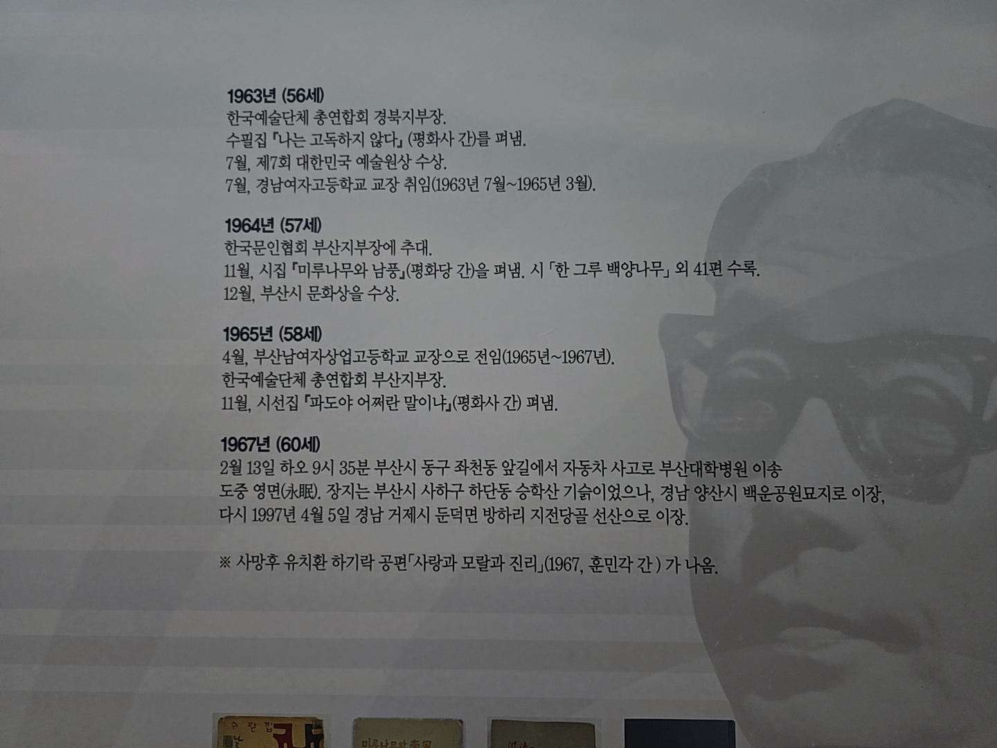 그 후 1957년에는 한국 시인협회장에 피선되었으며 경주여중고, 경주고, 경남여고 교장을 거쳐 1967년 부산남여상 교장 재임시 부산 좌천동에서 불의의 교통사고로 생을 마감한 한국 문단의 거목이다.