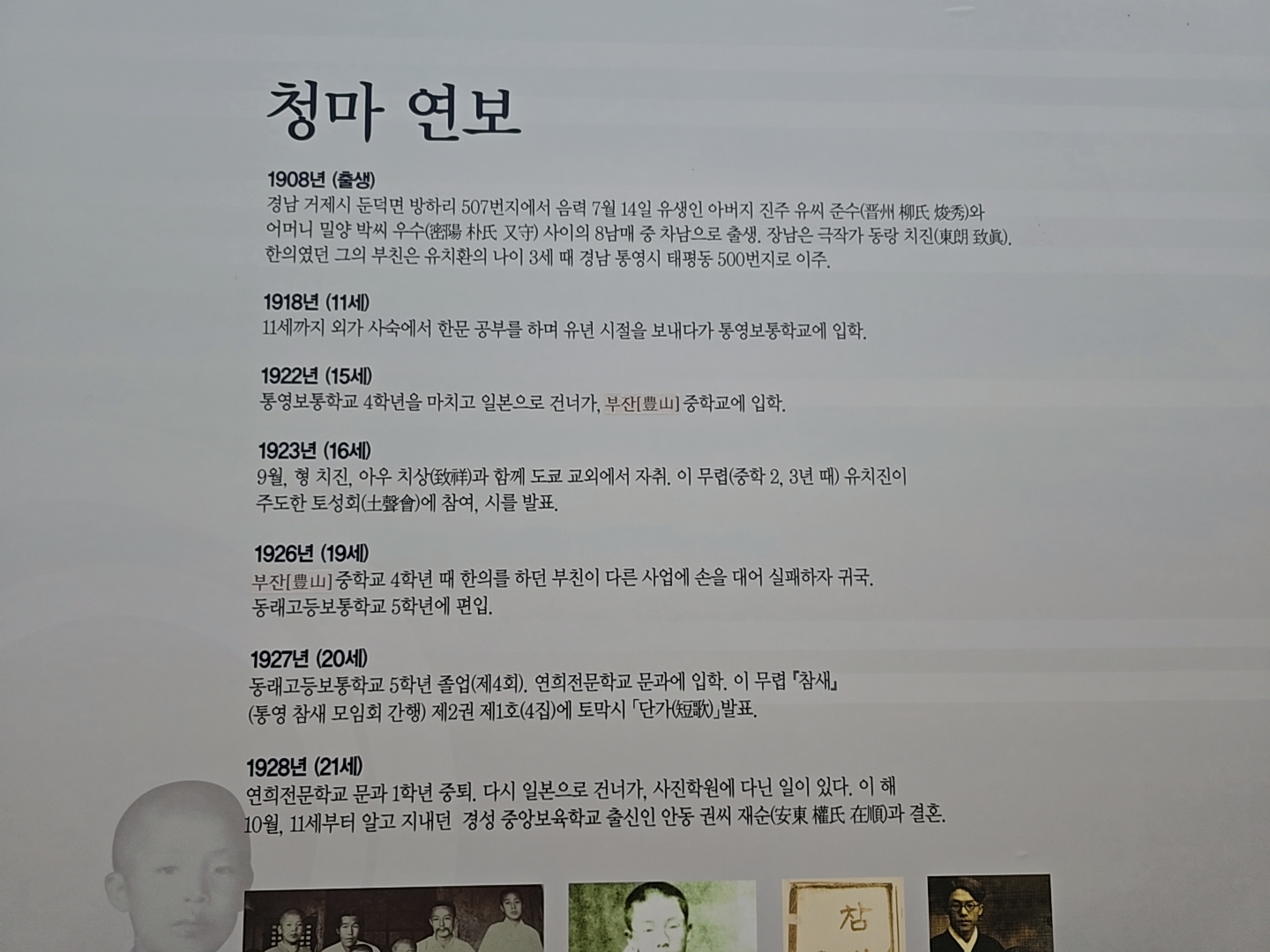 한국 근대문학사의 거목인 청마 유치환은 1908년 음력 7월 14일 아버지 유준수와 어 머니 박우수의 5남 3녀 중 차남으로 태어났다. 장남은 극작가로 널리 알려진 동랑 유치 진이다.