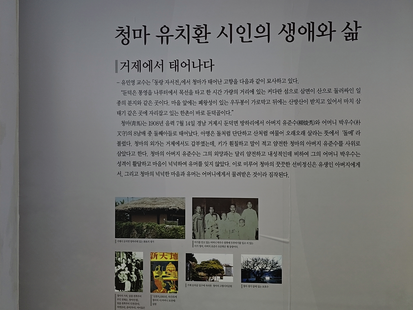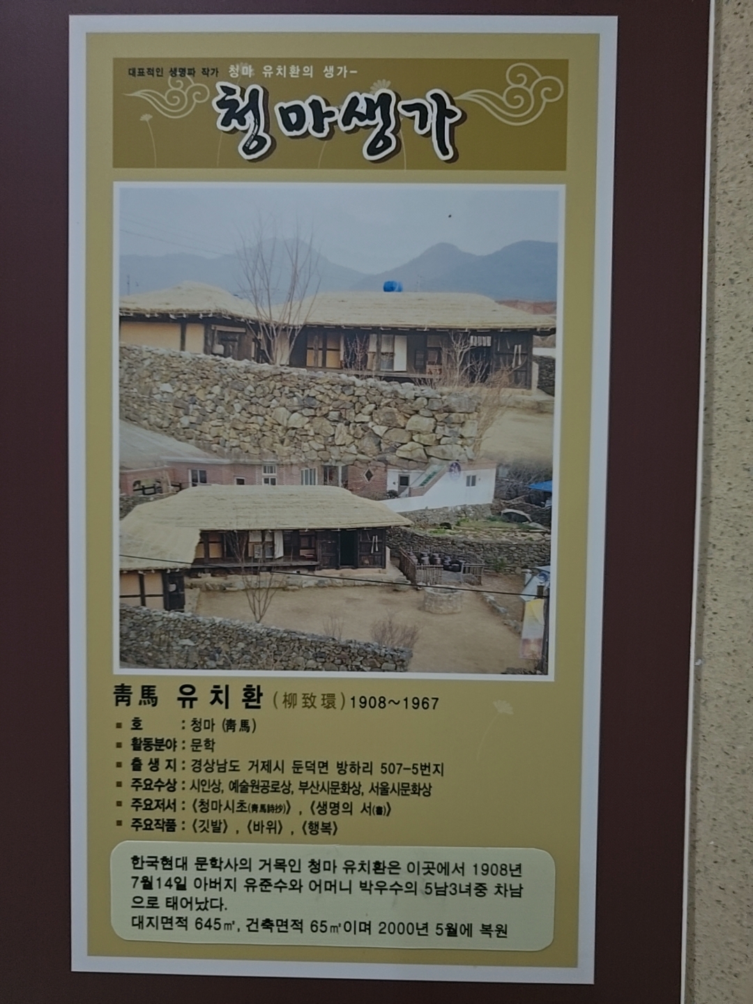 한국 근대문학사의 거목인 청마 유치환은 거제시 둔덕면 방하리 507-5번지인 이곳에서 1908년 음력 7월 14일 아버지 유준수와 어머니 박우수의 차남으로 태어났다. 청마선생은 11세까지 한학을 배웠으며 일본 토쿄 토요야마 중학교에 입학하였으나 가운이 기울어져 귀국, 1926년 동래고등보통학교 5년 편입 후 1927년 연희전문학교를 수료하였다.