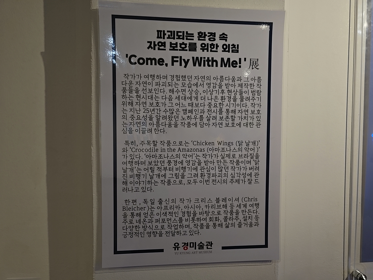 특히, 주목할 작품으로는 'Chichen wings(닭 날개)'와 Crocodile in the Amazonas(아마조나스의 악어)'가 있다. '아마조나스의 악어'는 작가가 실제로 브라질을 여행하며 보았던 풍경에 영감을 받아 만든 작품이며 '닭날개'는 어릴적부터 비행기에 관심이 많던 작가가 버려진 비행기 날개에 그림을 그려 환경파괴의 심각성에 관해 이야기하는 작품으로 모두 이번 전시의 주제가 잘 드러나고 있다.