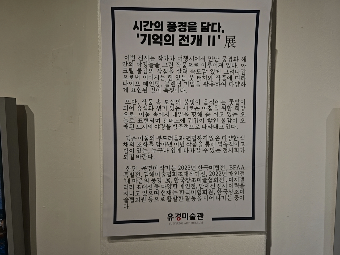 한편, 문경미 작가는 2023년 한국미협전, BFAA특별전, 김해미술협회초대작가전, 2022년 개인전 '내 마음의 풍경'전, 한국창조미술협회전, 미지갤러리 초대전 등 다양한 개인전, 단체전 전시 이력을 지니고 있으며 현재는 한국미술협회원, 한국창조미술협회원 등으로 활발한 활동을 이어 나가는 중이다.