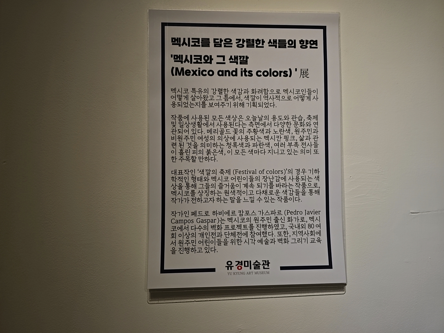 작가인 페드로 하비에르 캄포스 가스파르는 멕시코의 원주민 출신 화가로 멕시코에서 다수의 벽화 프로젝트를 진행하였고, 국내외 80여회 이상의 개인전과 단체전에 참여했다. 또한, 지역사회에서 원주민 어린이들을 위한 시각 예술과 벽화 그리기 교육을 진행하고 있다.