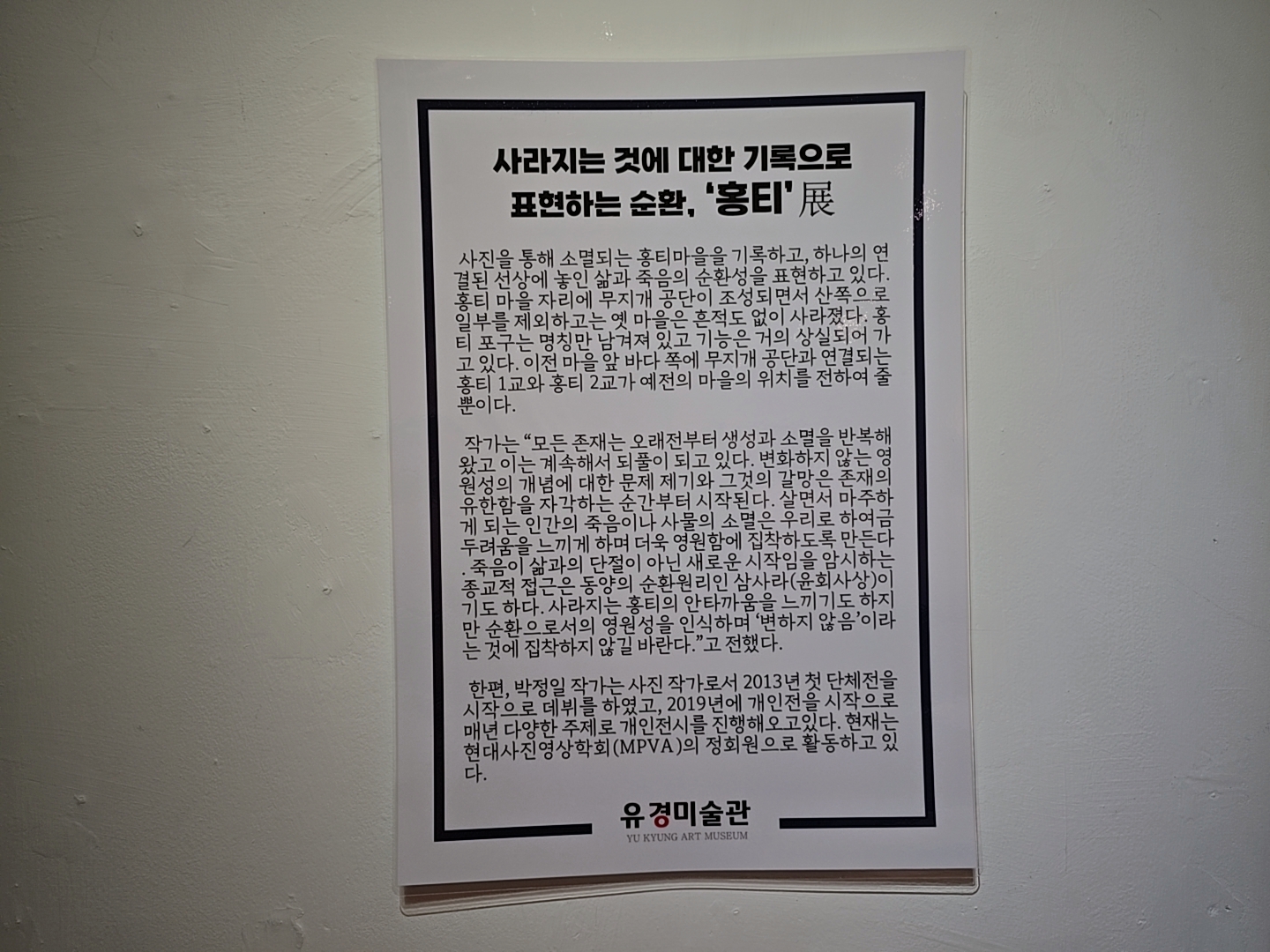 사진을 통해 소멸되는 홍티마을을 기록하고 하나의 연결된 선상에 놓인 삶과 죽음의 순환성을 표현하고 있다.